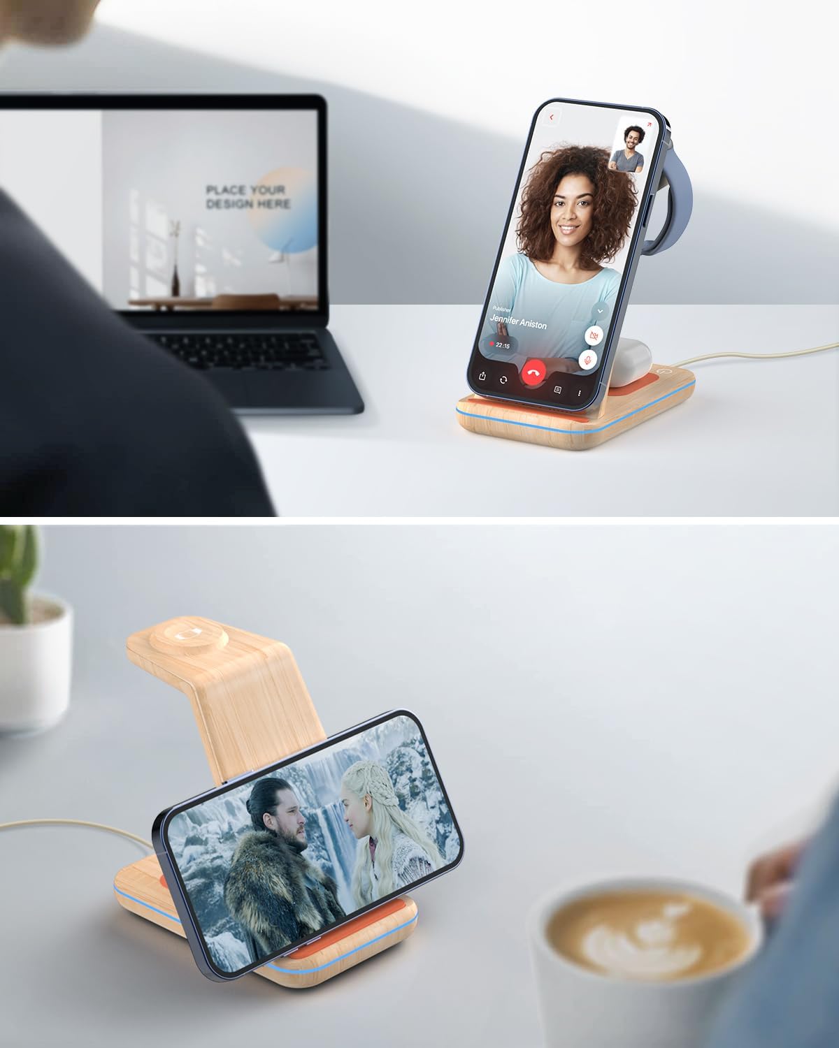 The Apple Watch and iPhone charging station has been specially designed with an ideal viewing angle of 60° and offers you a comfortable viewing experience, whether you are sitting or standing. It is ideal for watching videos and movies, making calls, etc.