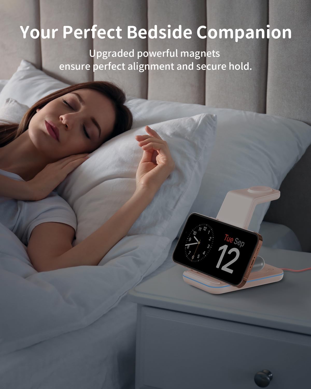 The indicator light of the iPhone charging station flashes when a power source is connected. Simply place the devices on the wireless charging pad to start charging. The corresponding light lights up and then turns off automatically within 20 seconds.