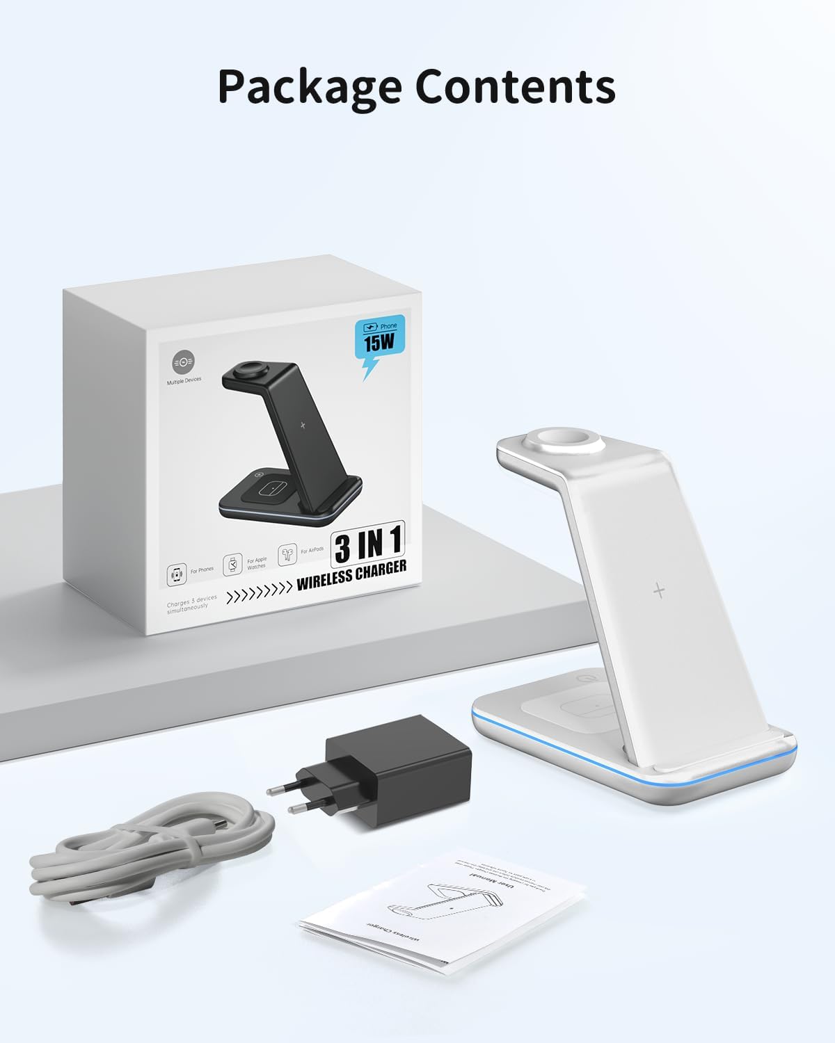 Търсите ли удобно и високоефективно зарядно устройство, с което да зареждате едновременно вашия iPhone, Apple Watch и Airpods? Не търсете повече от зарядната станция Geekera 3-в-1 на Apple. Тя е преминала официалното WPC оторизиране чрез споразумение за безжично зареждане QI и ви предлага висококачествено безжично зареждане (Забележка: Qi регистрационният идентификатор е 12220).