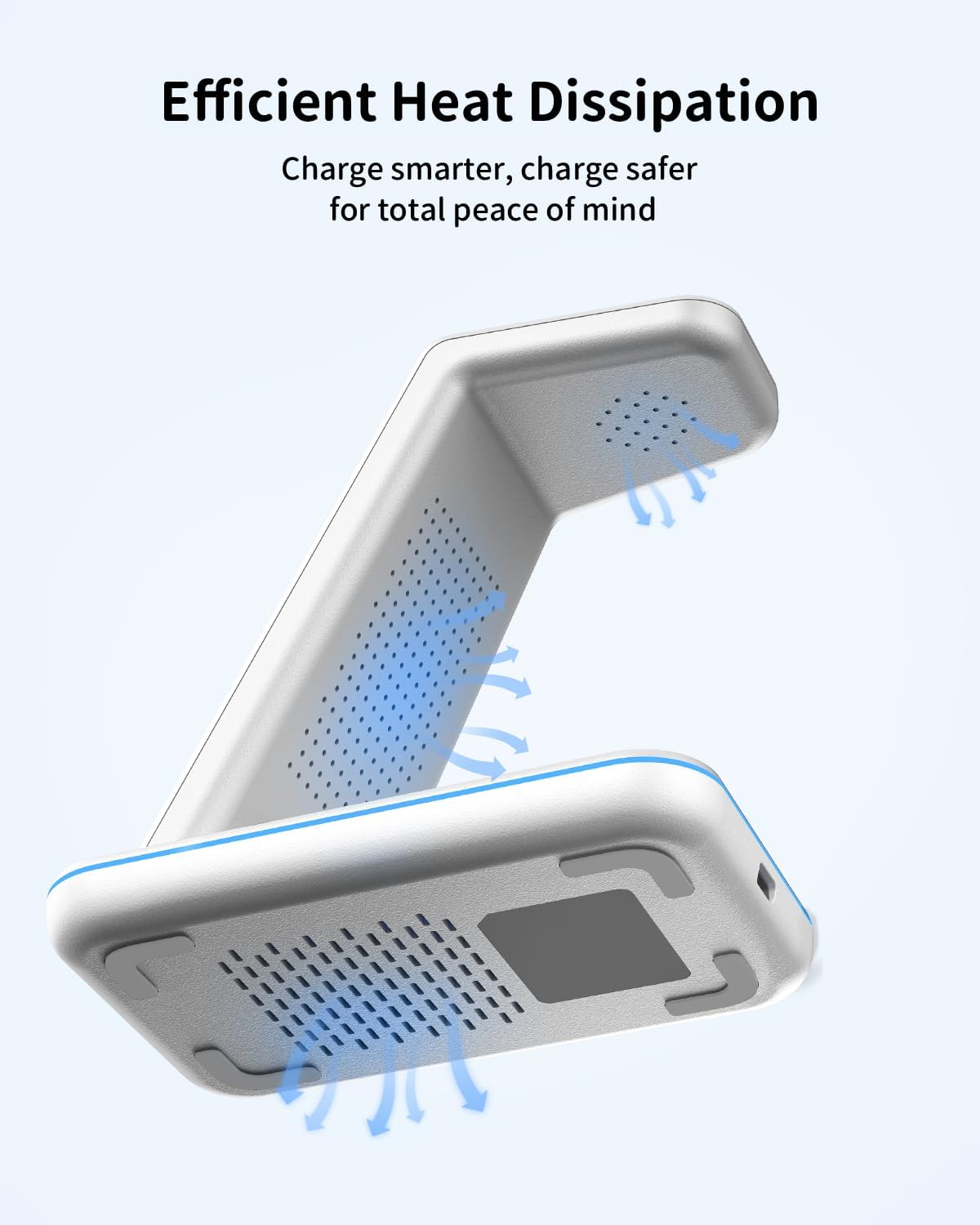 Even if three devices are charged at the same time, your device cannot be damaged by overheating because the back of the wireless charger is equipped with multiple heat dissipation holes, which provide comprehensive protection.