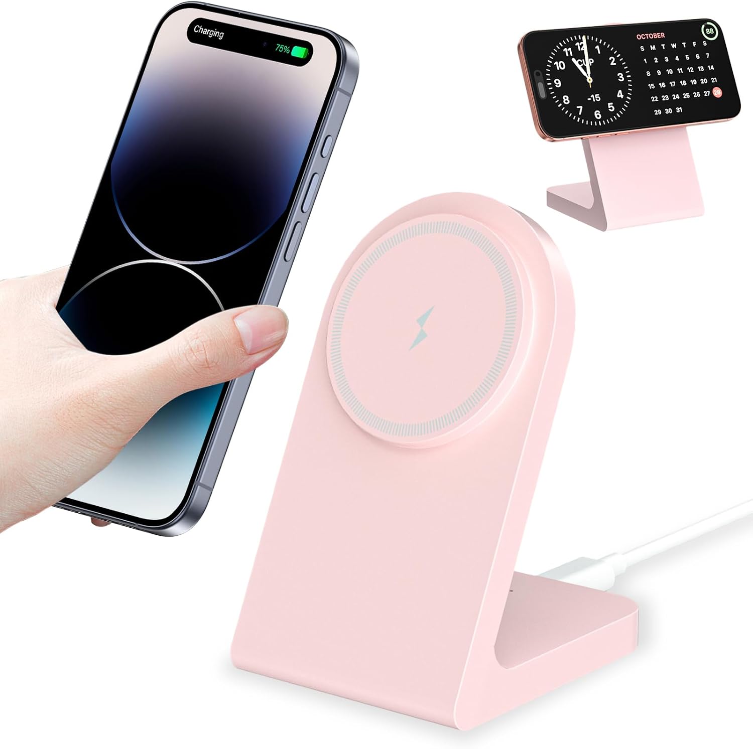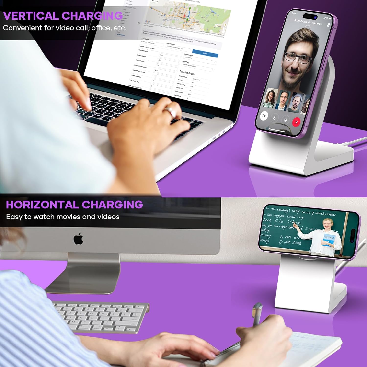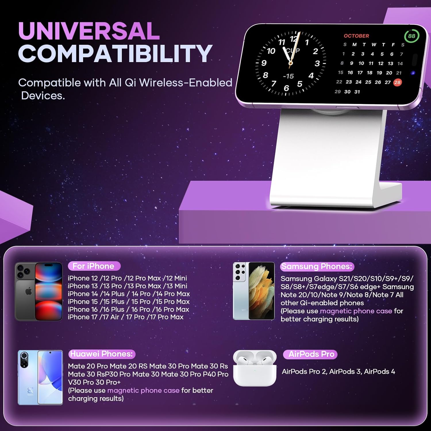• Универсална съвместимост - Тази станция за зареждане на iPhone може да зарежда всички мобилни телефони от серията iPhone 16, iPhone 15, iPhone 14, iPhone 13, iPhone 12. Магнитното зарядно е съвместимо и с AirPods Pro 2, AirPods 3. ПОЛЕЗНИ СЪВЕТИ: Всички останали телефони, които поддържат само безжично зареждане, трябва да се зареждат с магнитен калъф за по-добри резултати.