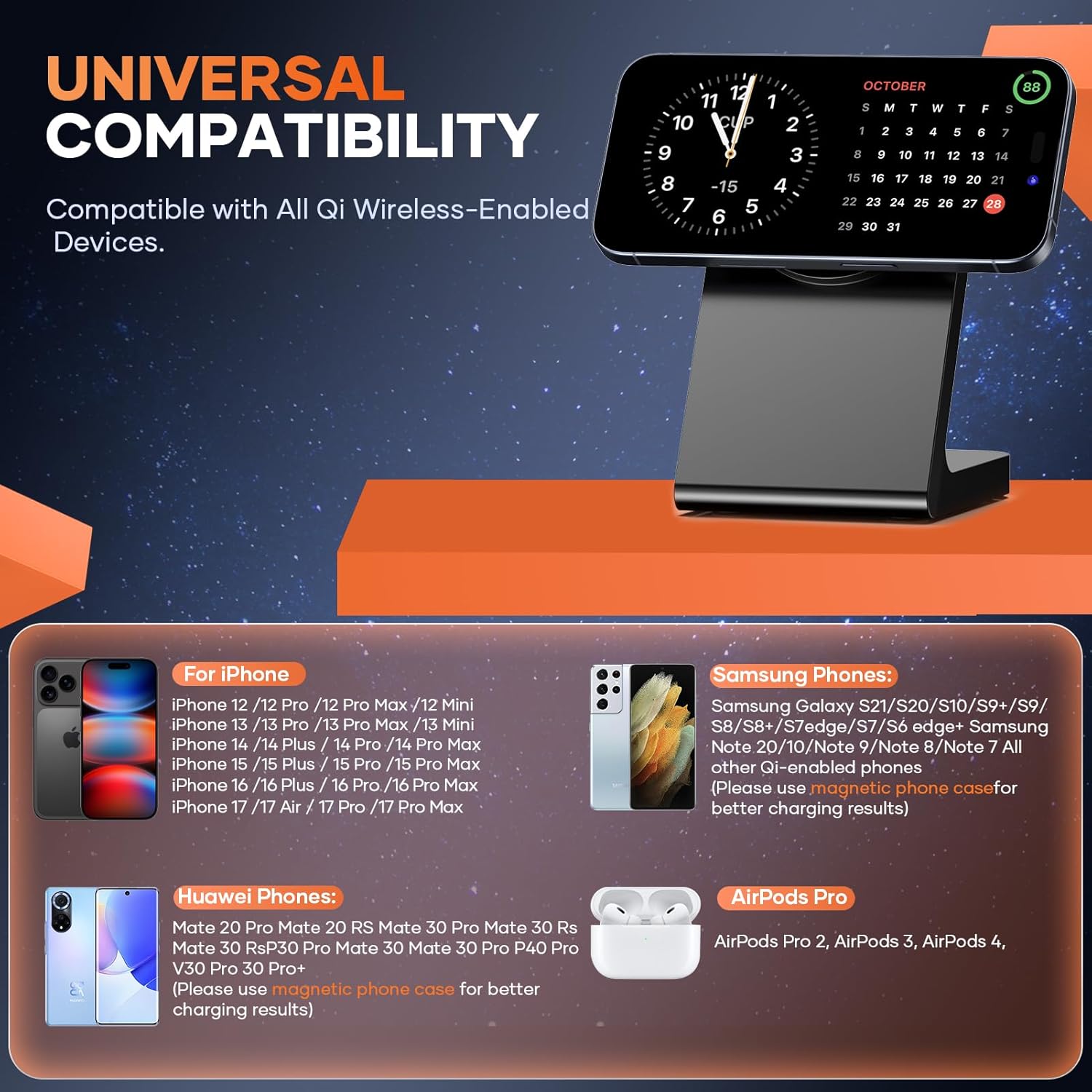 • Универсална съвместимост - Тази станция за зареждане на iPhone може да зарежда всички мобилни телефони от серията iPhone 16, iPhone 15, iPhone 14, iPhone 13, iPhone 12. Магнитното зарядно е съвместимо и с AirPods Pro 2, AirPods 3. ПОЛЕЗНИ СЪВЕТИ: Всички останали телефони, които поддържат само безжично зареждане, трябва да се зареждат с магнитен калъф за по-добри резултати.