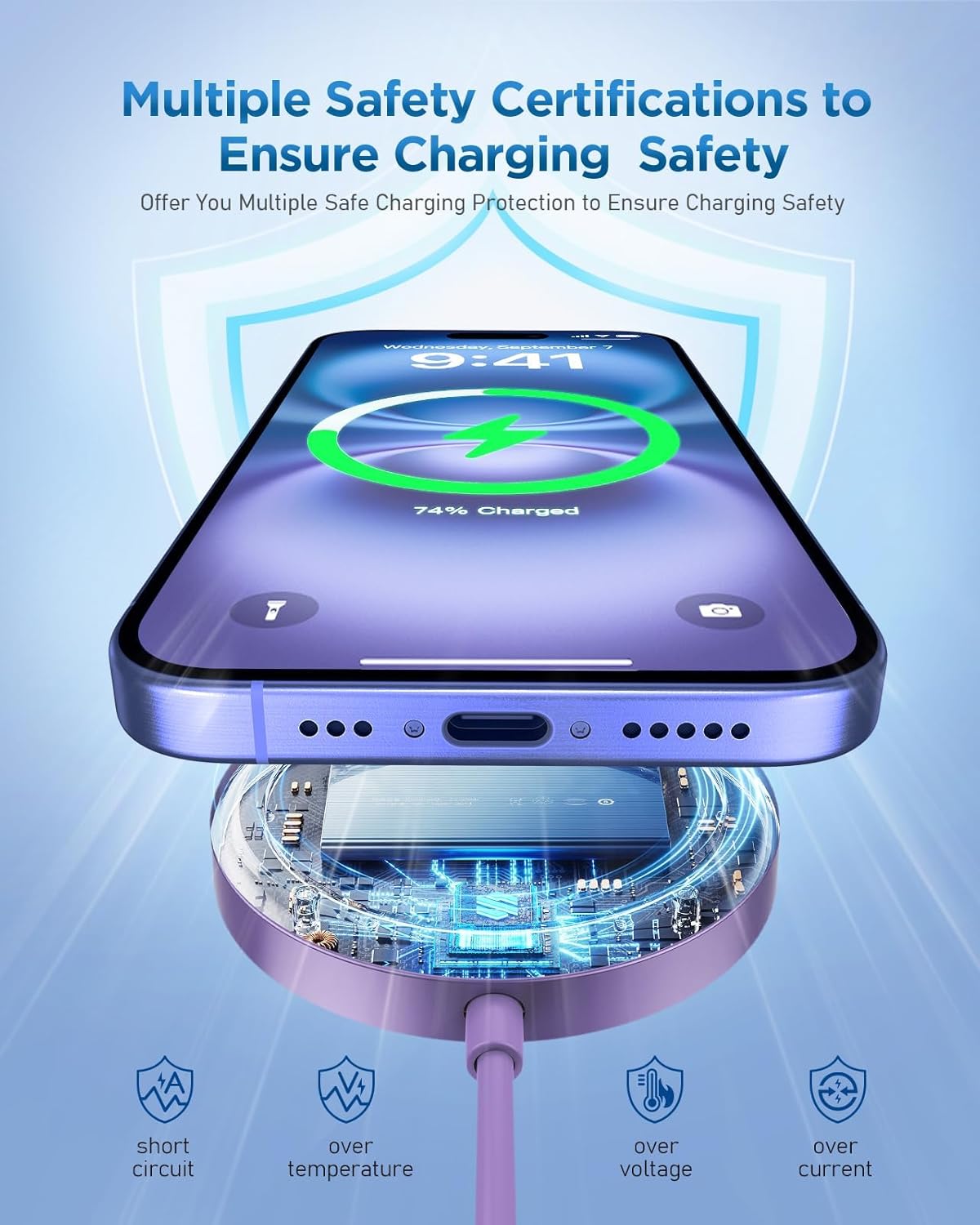 Безжично зарядно Mag-Safe за iPhone: Магнитна станция за зареждане, индуктивна безжична подложка за зареждане, съвместима с iPhone 17 Air 16e 16 15 14 13 12 и Air Pods 4-2 Pro с 20 W бърз адаптер (лилаво)