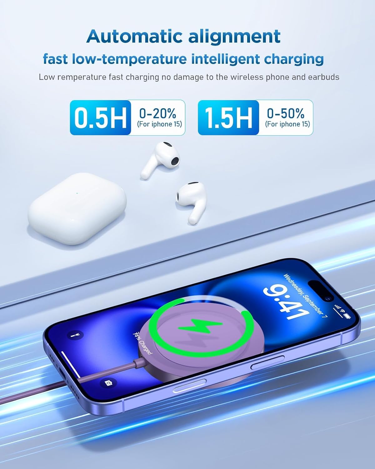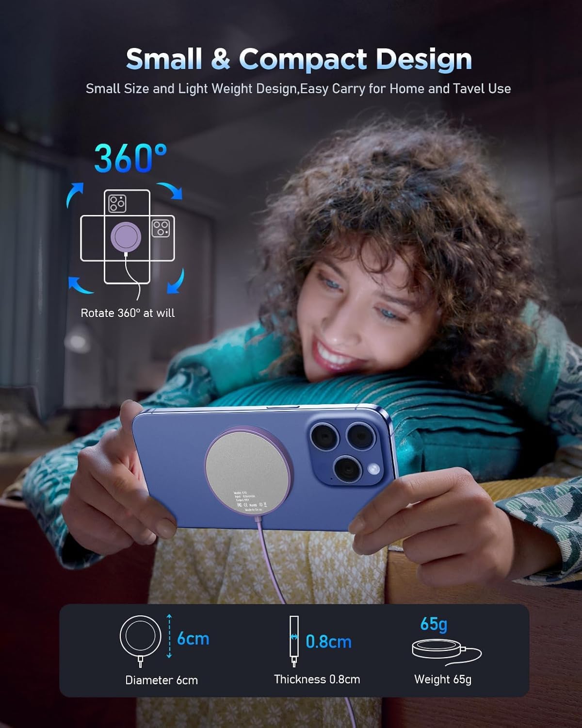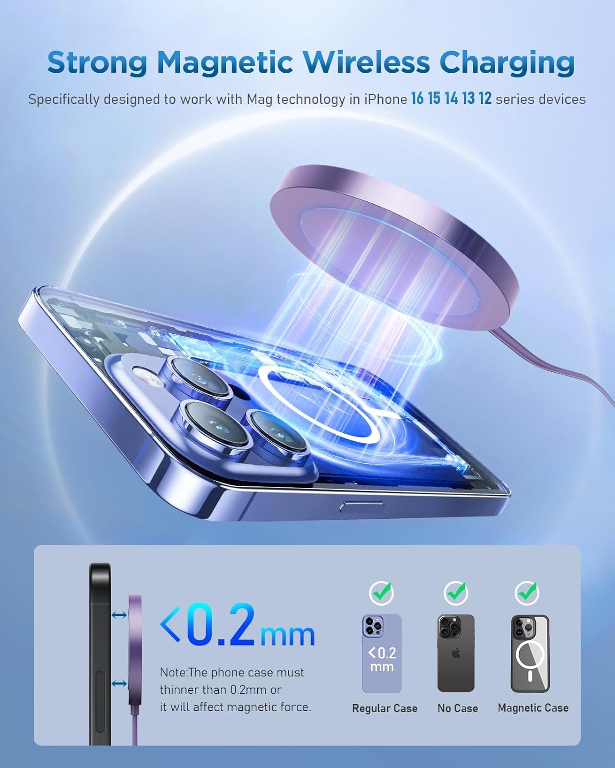 • Широка съвместимост Новото зарядно Mag-Safe е съвместимо с iPhone 17 16 15 14 13 12, за iPhone 17 16 15 14 13 12 Pro, за iPhone 17 16 15 14 13 12 Pro Max, за iPhone Air, за iPhone 16 15 14 Plus, за iPhone 12 14 3 Mini и Air Pods 4 3 2 Pro; магнитното безжично зарядно се предлага с допълнителен 1,2-метров кабел, който може значително да разшири свободата ви на движение.