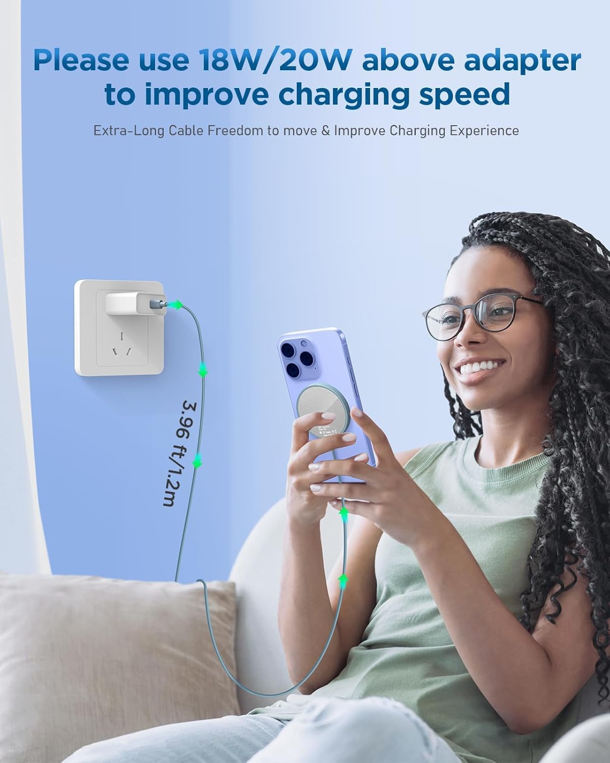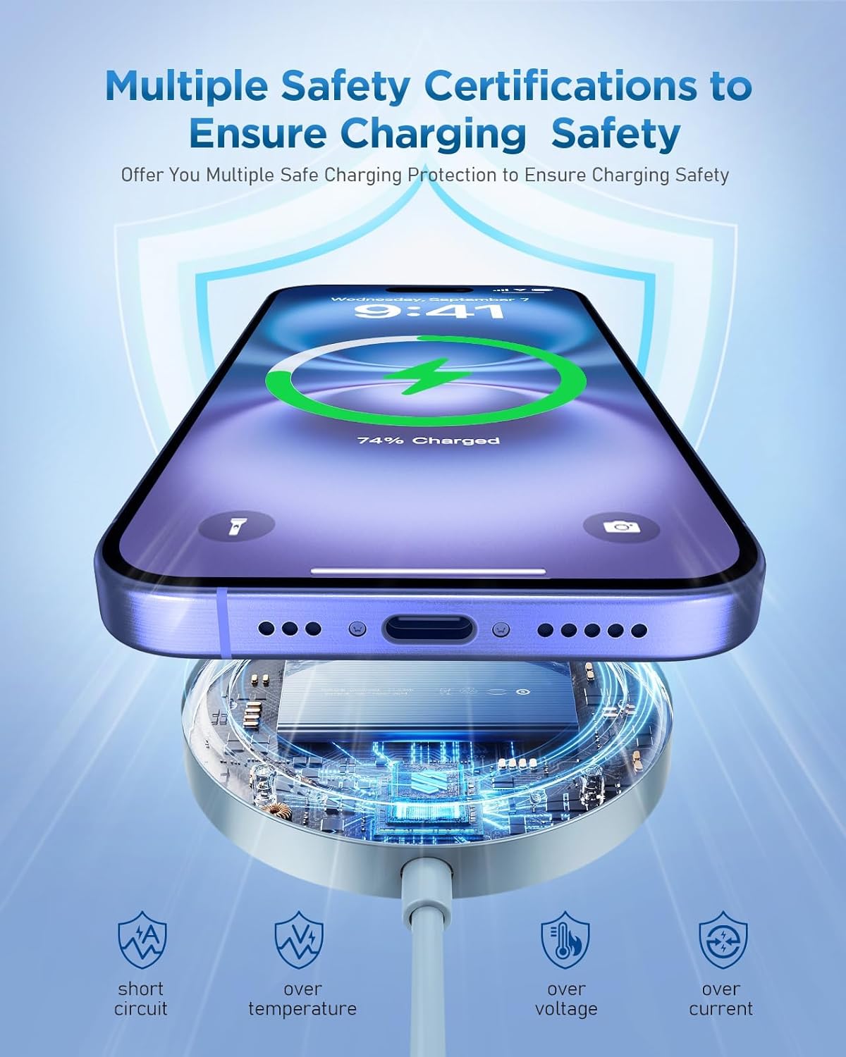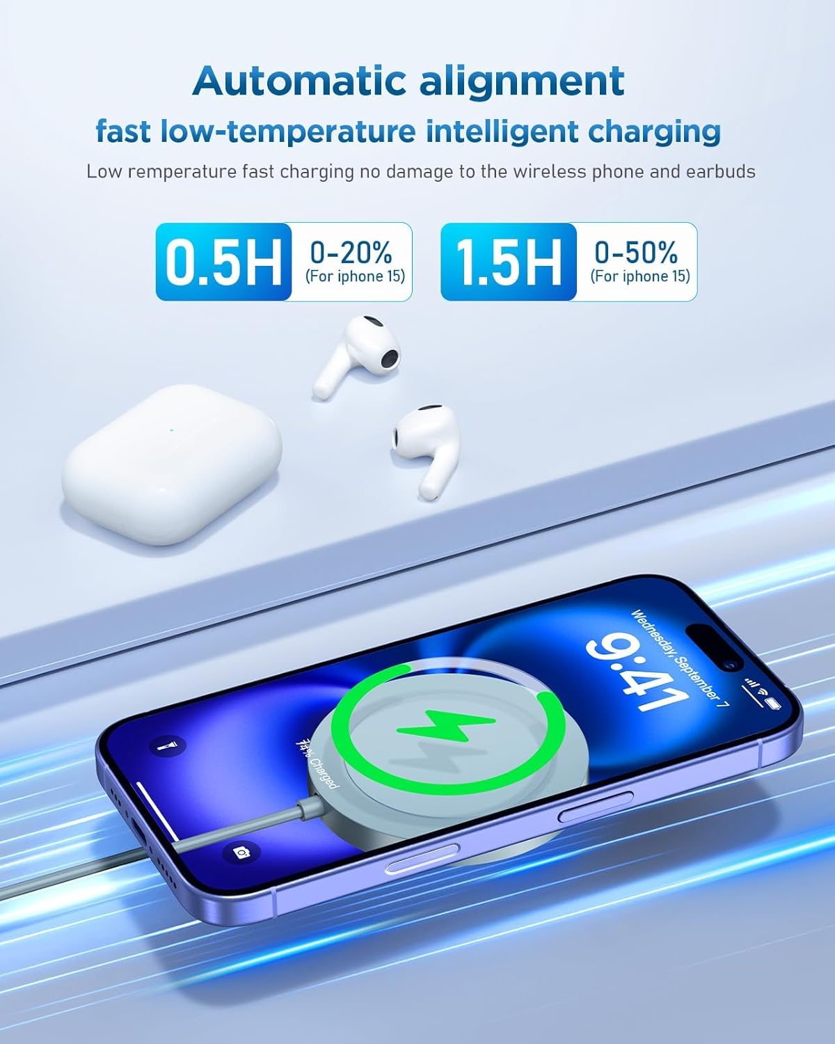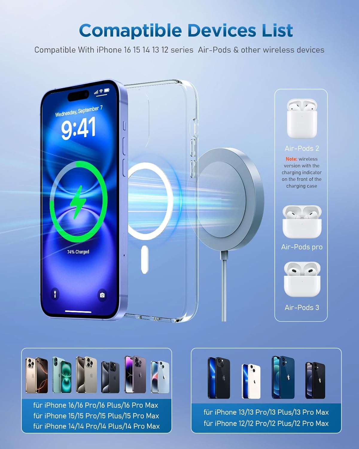 • Широка съвместимост Новото зарядно Mag-Safe е съвместимо с iPhone 17 16 15 14 13 12, за iPhone 17 16 15 14 13 12 Pro, за iPhone 17 16 15 14 13 12 Pro Max, за iPhone Air, за iPhone 16 15 14 Plus, за iPhone 12 14 3 Mini и Air Pods 4 3 2 Pro; магнитното безжично зарядно се предлага с допълнителен 1,2-метров кабел, който може значително да разшири свободата ви на движение.