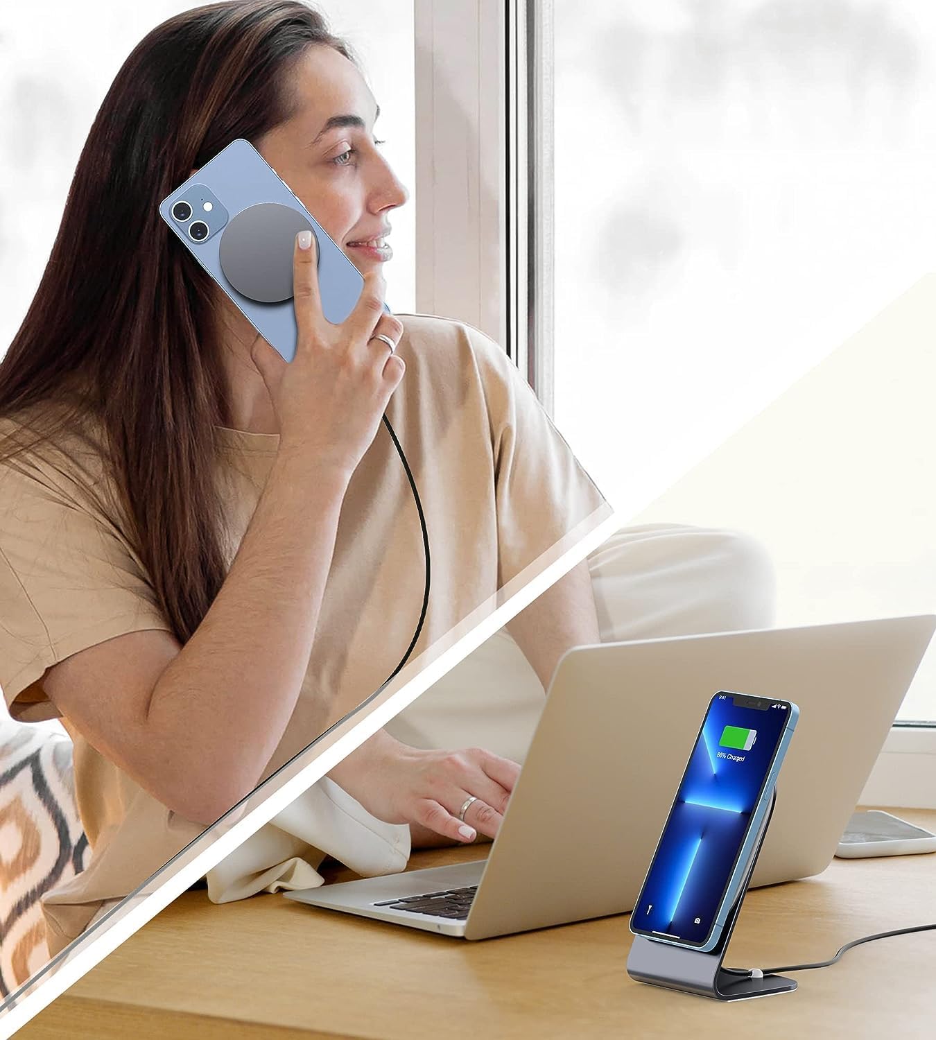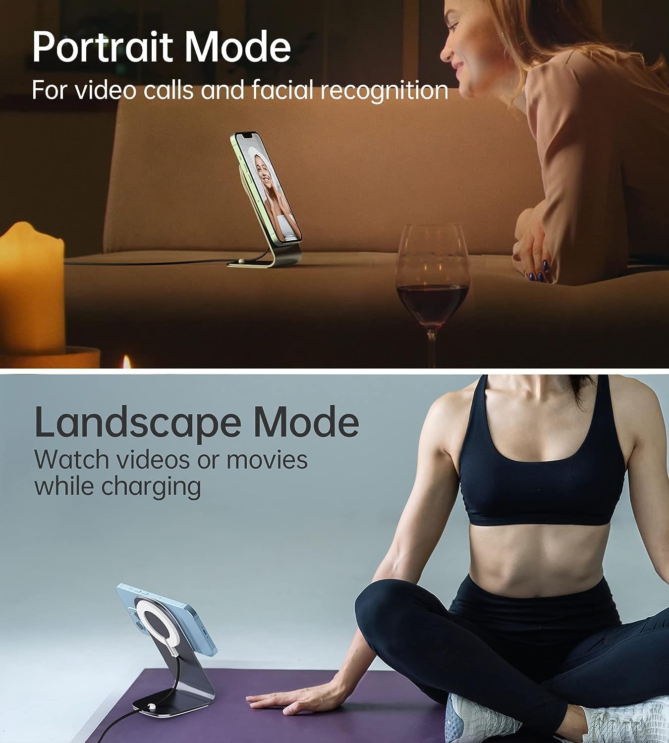Заредете вашия iPhone 12 на магнитната стойка или просто поставете вашия iPhone 12, AirPods или други слушалки върху магнитната подложка за зареждане, за да го заредите бързо безжично.