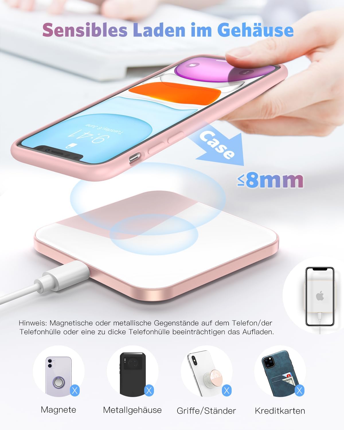 • Подходящ за калъфи и безопасен: нашето безжично бързо зарядно устройство поддържа калъфи за мобилни телефони с дебелина ≤ 8 мм, така че вече не е необходимо да сваляте калъфа на мобилния телефон многократно. Но се уверете, че по калъфа на телефона няма магнити, метали, кредитни карти и други чужди предмети. QI и UL сертификацията с многофункционална интелигентна технология за защита осигурява контрол на температурата, защита от пренапрежение и претоварване, предотвратяване на късо съединение и откриване на чужди предмети.