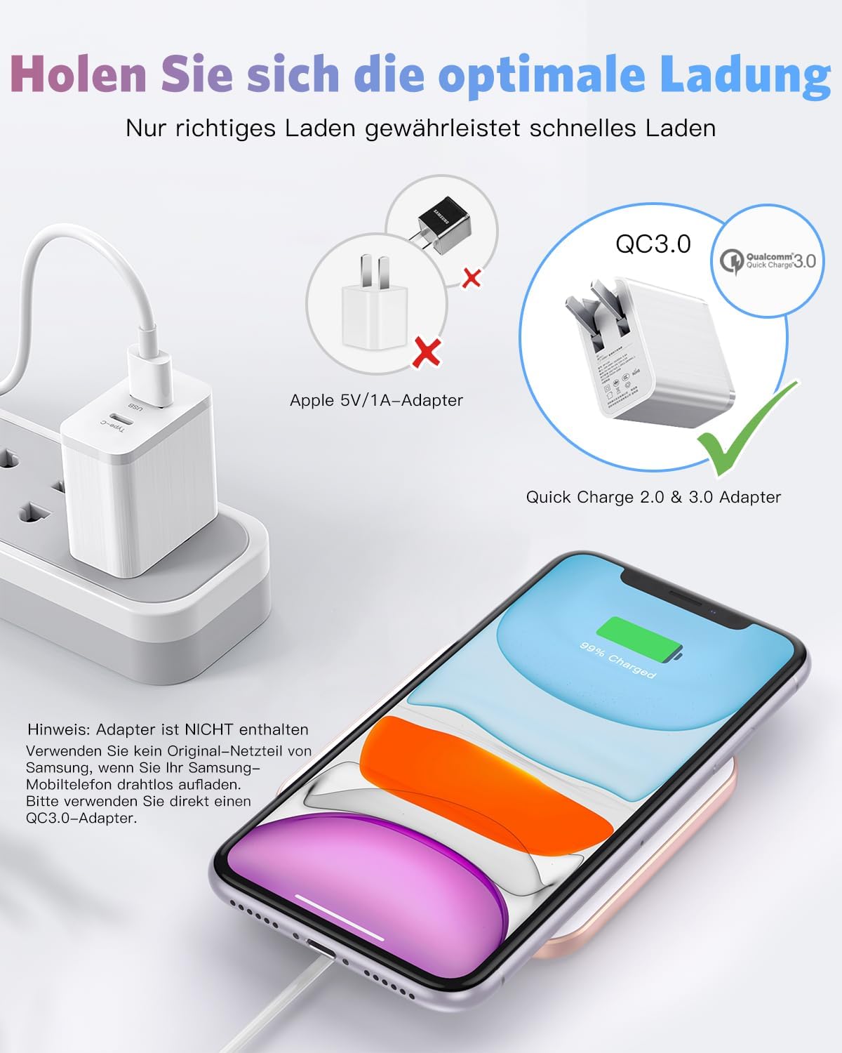 • Безжично зарядно за iPhone/AirPods. Забележка: Нашето безжично зарядно не поддържа смарт часовници. Безжично зарядно 7.5W бързо зареждане за вашия iPhone 13/13 Pro/13 ProMax/13 Mini/12/12 ProMax/12 Pro/11/11 Pro/11 ProMax/XS MAX/XR/X/8/8 Plus, но е необходимо QC 2.0/3.0 захранване; 5W безжично зареждане за AirPods Pro/AirPods 2. С нашата Qi-сертифицирана станция за зареждане можете да зареждате телефона си, например iPhone 10, без щепсел и кабел.