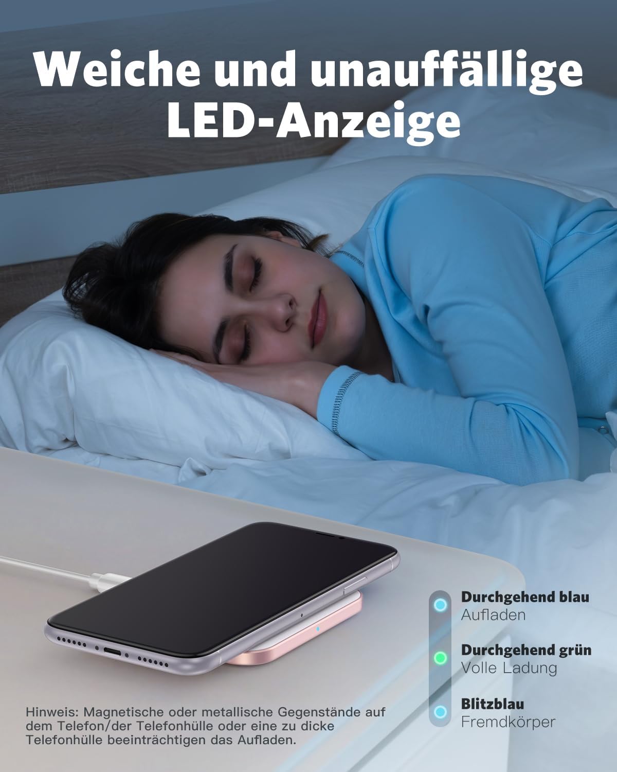 • Зарядно за нощно шкафче, удобно за сън, с безопасно зареждане: с 4 неплъзгащи се крачета, ултратънкото Qi зарядно може да остане стабилно и на гладко място. LED светлината на безжичната станция предоставя информация за състоянието на зареждане на батерията и свети в синьо в режим на зареждане. Когато батерията е 100% заредена, светлината става зелена. Нежната и приятна светлина не ви смущава, докато спите.
