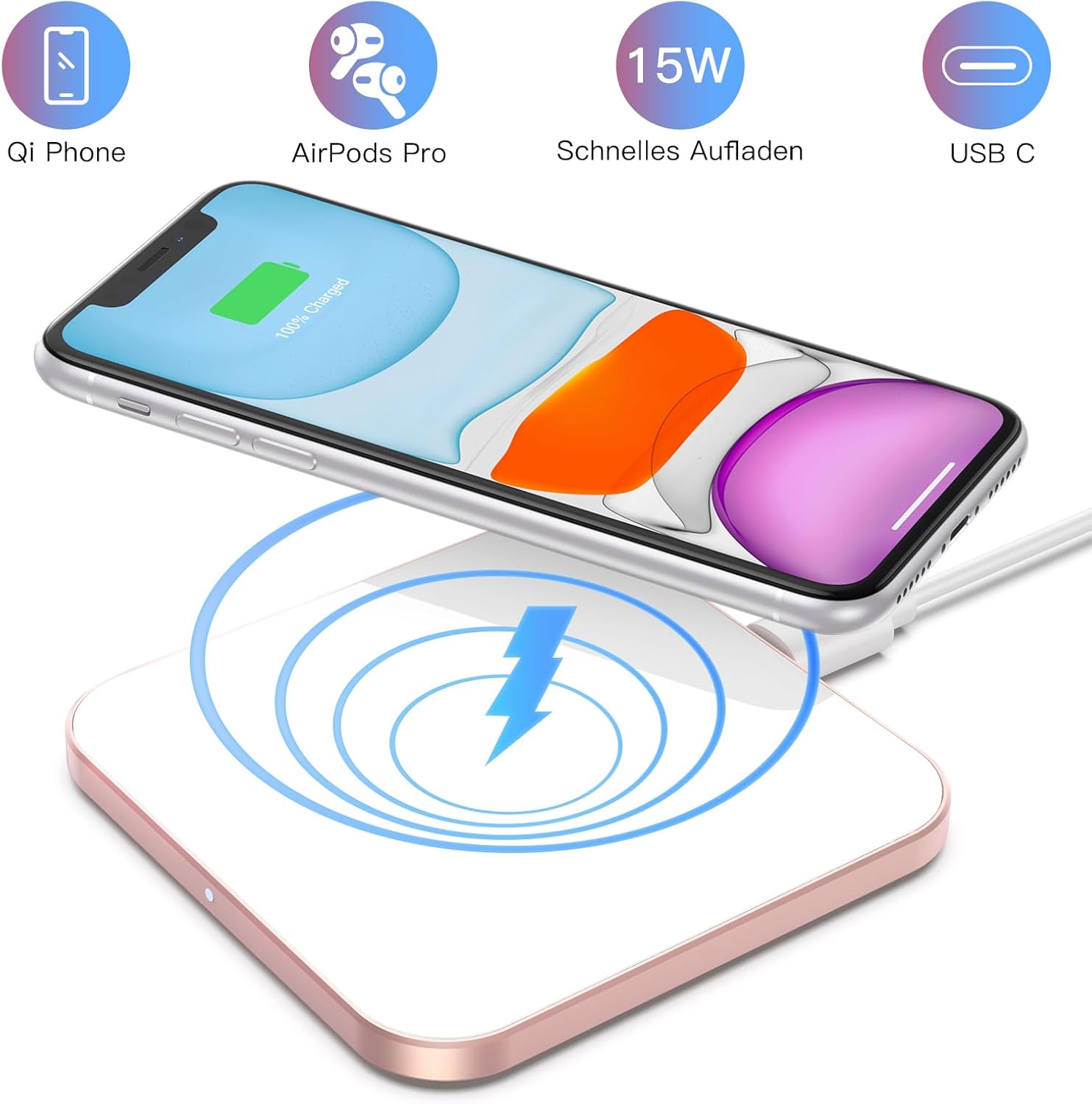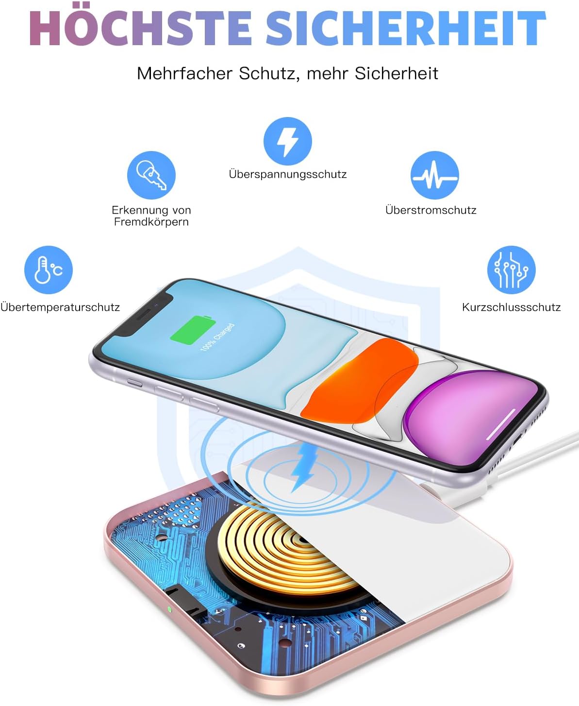 • Елегантен дизайн и професионализъм: Тъй като няма вентилатор, работи безшумно. С дебелина от 6 мм, това е перфектно преносима ултратънка зарядна подложка за дома и офиса, много спестяваща място, която ще поддържа вашия работен плот, бюро и нощно шкафче подредени и организирани. Повърхността, изработена от стъкло и алуминий, прави това безжично зарядно устройство страхотно и елегантно. Практичен подарък за празненства и рождени дни.