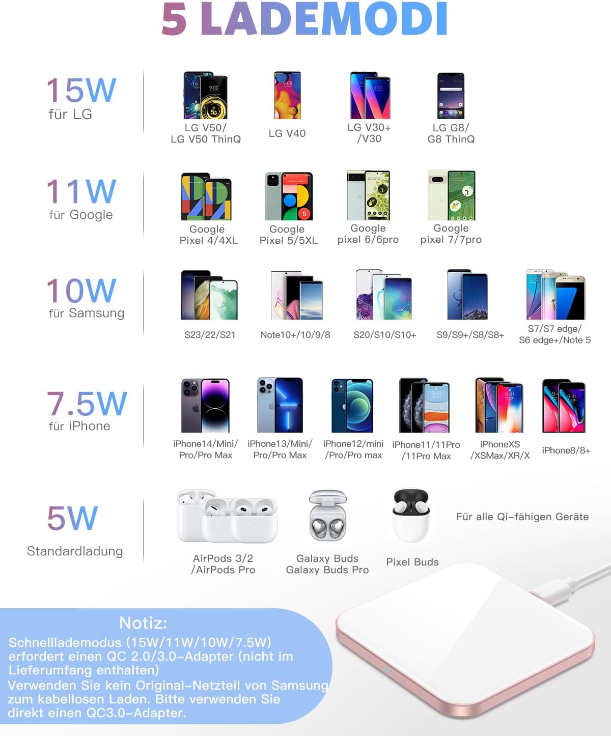 • Индуктивна зарядна станция за Samsung Galaxy: 10W безжично бързо зареждане за Galaxy Note 10 / Note 10+ / S10 / S10+ / S10e / Note 9 / S20 FE / S21 / S20 / S9 / S9+ / Note 8 / S8 / S8+ / S7; с усъвършенствания високопроизводителен чипсет, безжичното зарядно устройство осигурява бързо безжично зареждане до 15 W за LG G7 / V30 / V35 / V40 ThinQ; 5W стандартен режим за всички останали Qi-съвместими устройства.