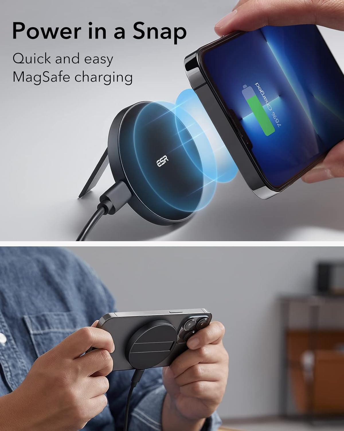 Безжично зарядно устройство ESR HaloLock, съвместимо с MagSafe/iPhone 15/15 Plus/15 Pro/15 Pro Max и iPhone 14/13/12 Series/магнитен калъф, 1.5 м USB-C кабел за бързо зареждане, без адаптер, черно