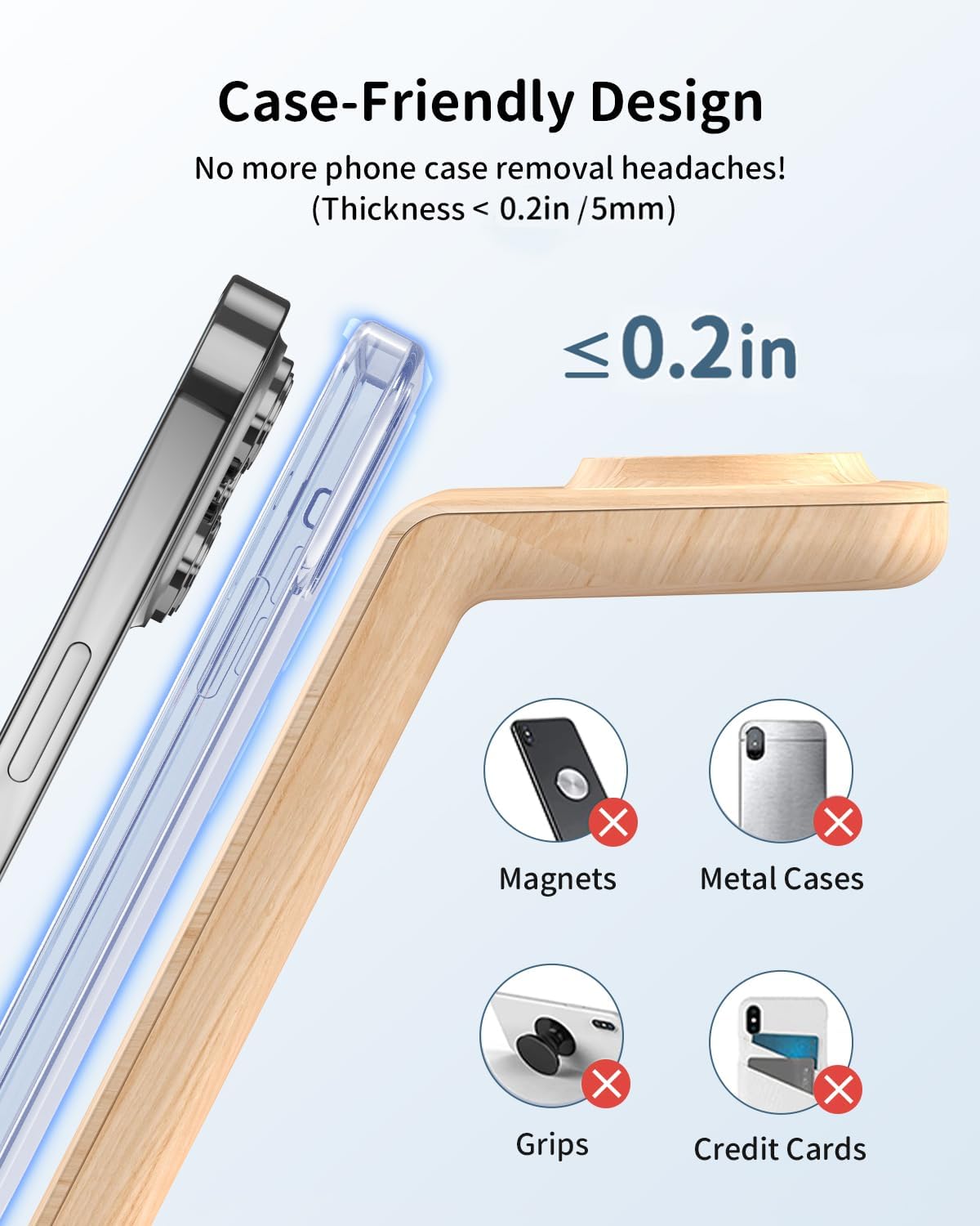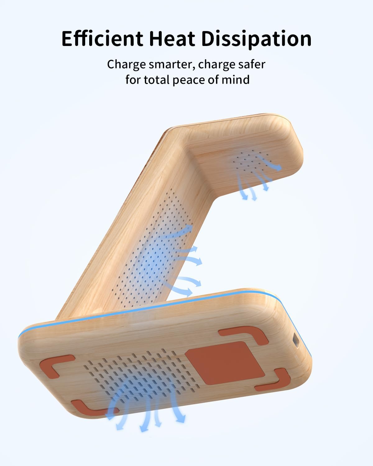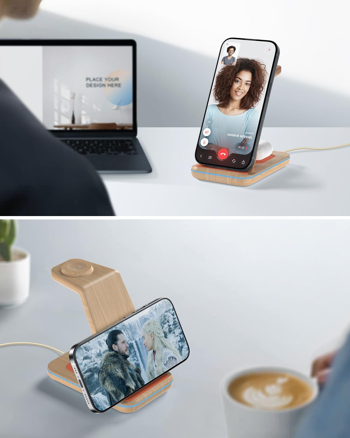• Зарядно за iPhone и поставка за телефон в едно Нашето безжично зарядно за iPhone е и практична поставка за телефон, която осигурява оптимален комфорт при гледане. Заема малко място на бюрото ви и по този начин осигурява ред и общ преглед. А най-хубавото? Неплъзгащите се силиконови подложки гарантират, че устройствата ви ще останат сигурно на мястото си, предпазвайки ги от случайни подхлъзвания и падания!