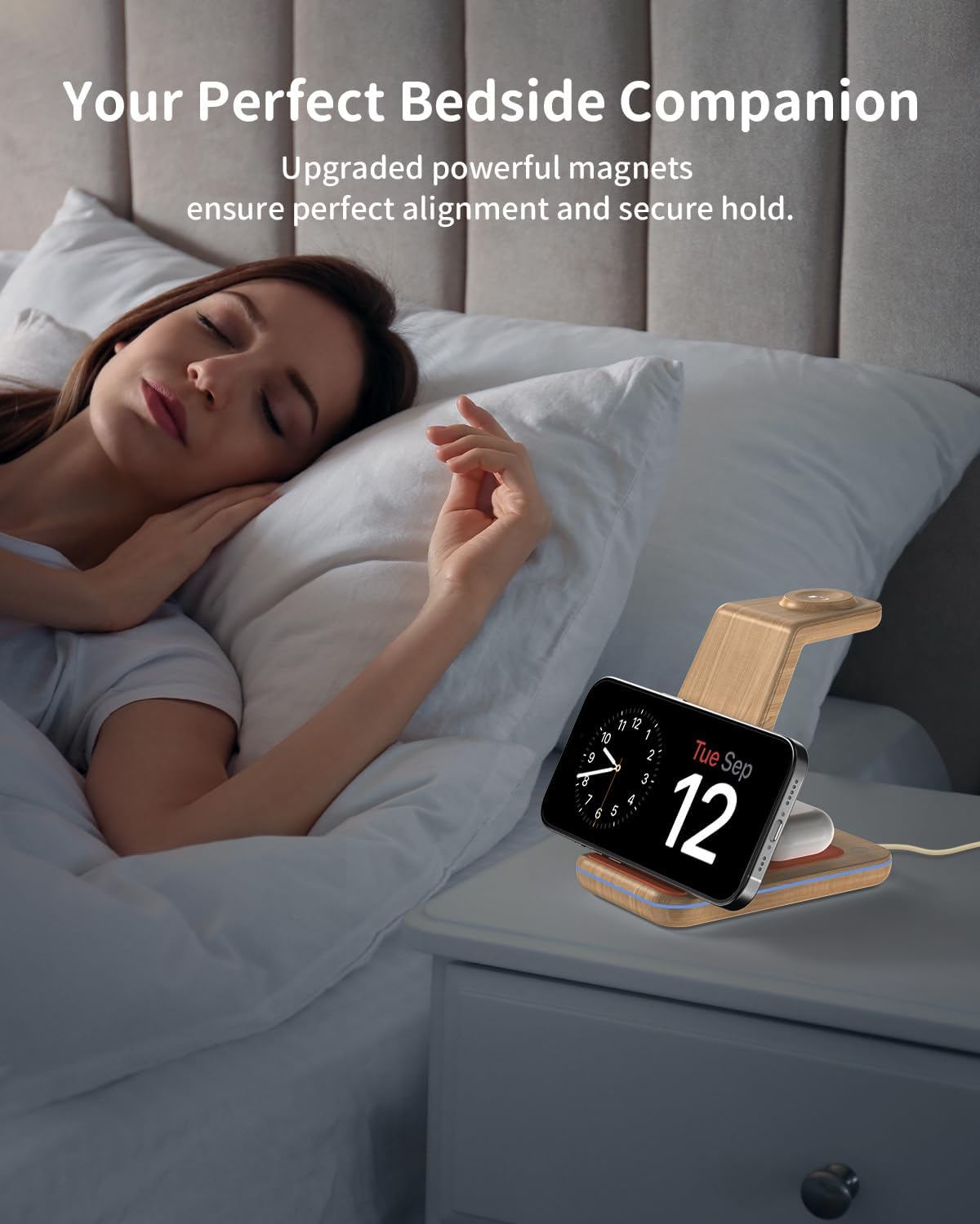 • Зареждайте устройствата си, а не съня си: сънят е ценен, точно както и спокойствието ви. Нашата станция за зареждане на мобилни телефони знае стойността на спокойния нощен сън. Ето защо сме прикрепили сензорен бутон към станцията за зареждане на iPhone, който ви позволява да изключите индикаторната светлина. Край на досадните разсейвания или ярките светлини, докато се опитвате да заспите. Спете спокойно!