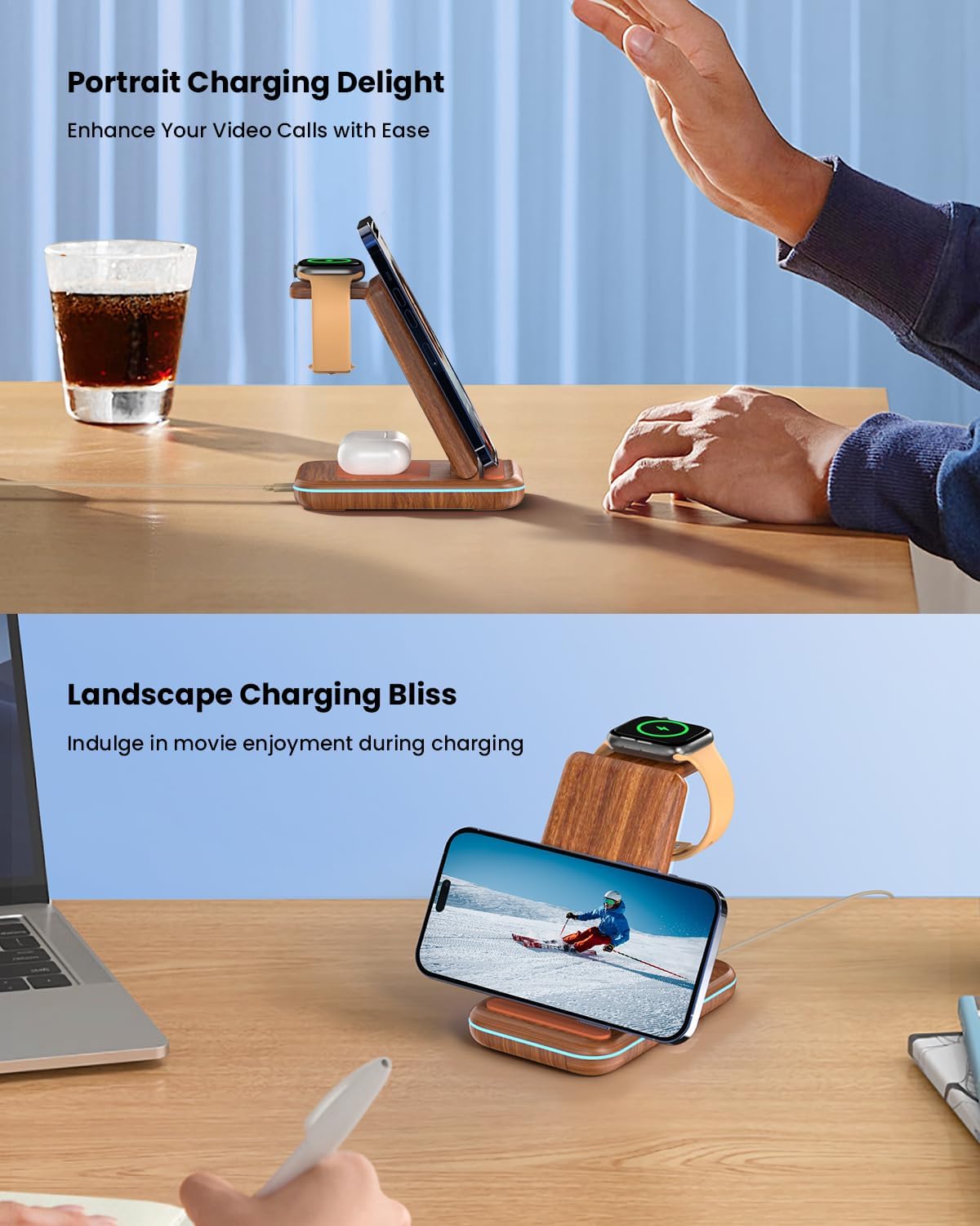 • Зарядно за iPhone и поставка за телефон в едно Нашето безжично зарядно за iPhone е и практична поставка за телефон, която осигурява оптимален комфорт при гледане. Заема малко място на бюрото ви и по този начин осигурява ред и общ преглед. А най-хубавото? Неплъзгащите се силиконови подложки гарантират, че устройствата ви ще останат сигурно на мястото си, предпазвайки ги от случайни подхлъзвания и падания!