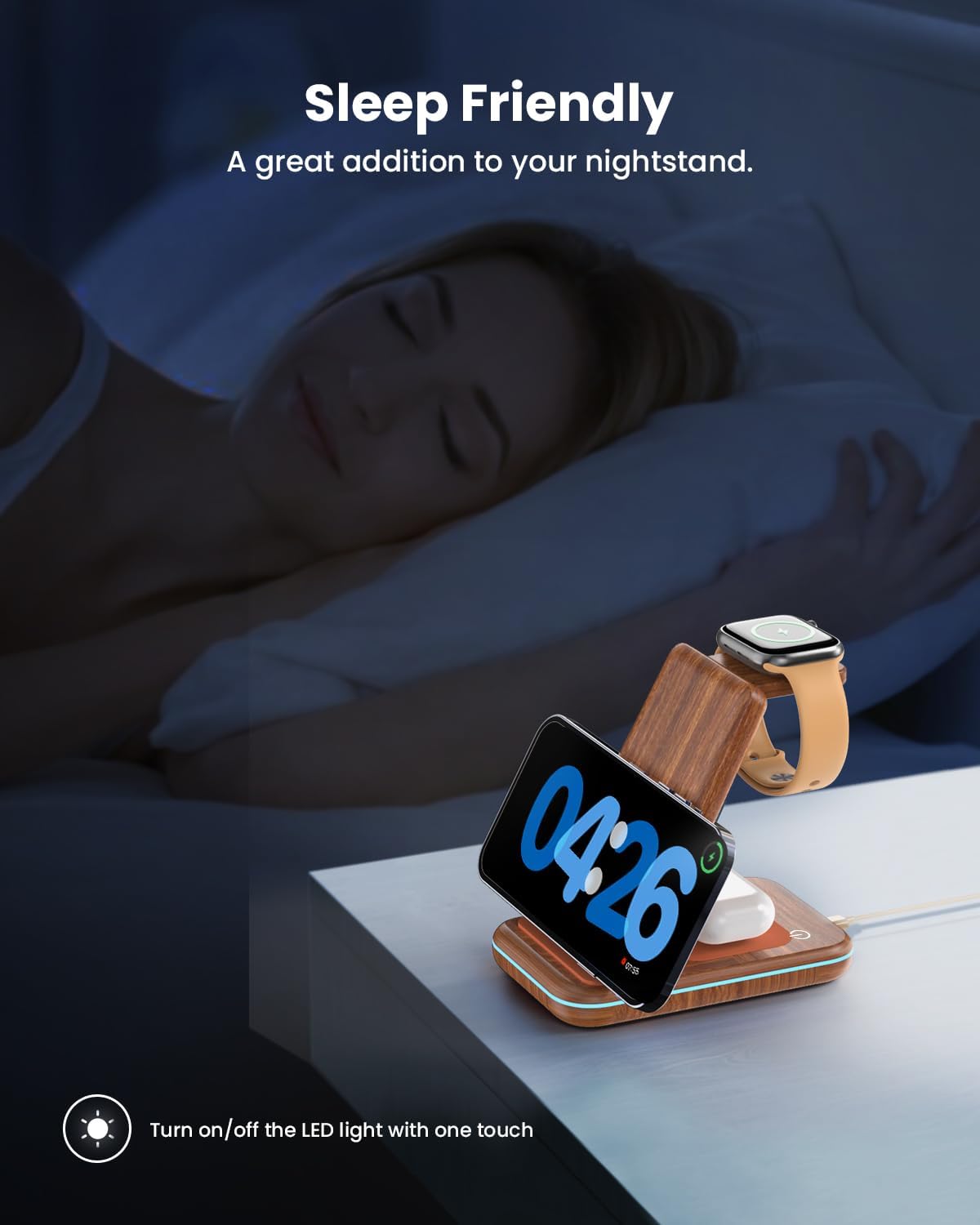• Зареждайте устройствата си, а не съня си: сънят е ценен, точно както и спокойствието ви. Нашата станция за зареждане на мобилни телефони знае стойността на спокойния нощен сън. Ето защо сме прикрепили сензорен бутон към станцията за зареждане на iPhone, който ви позволява да изключите индикаторната светлина. Край на досадните разсейвания или ярките светлини, докато се опитвате да заспите. Спете спокойно!