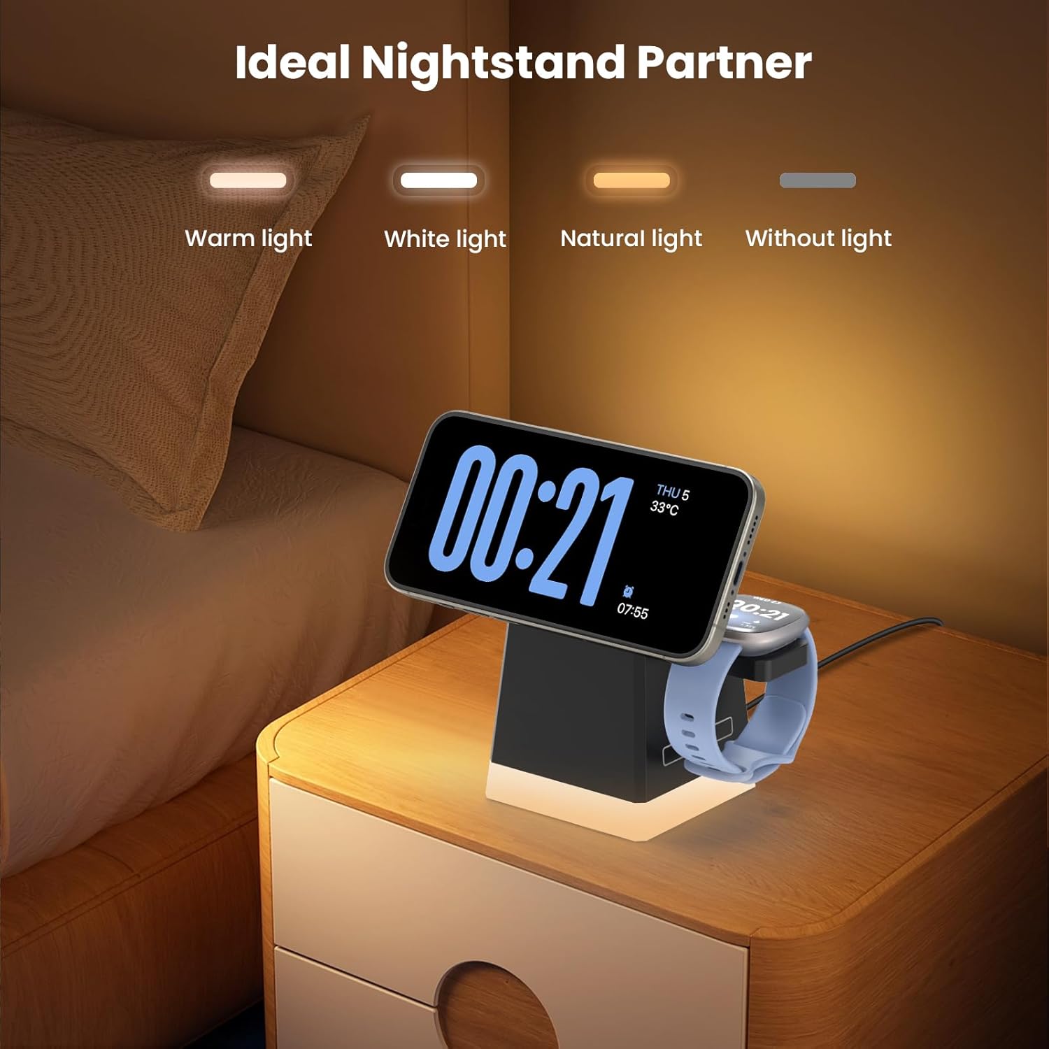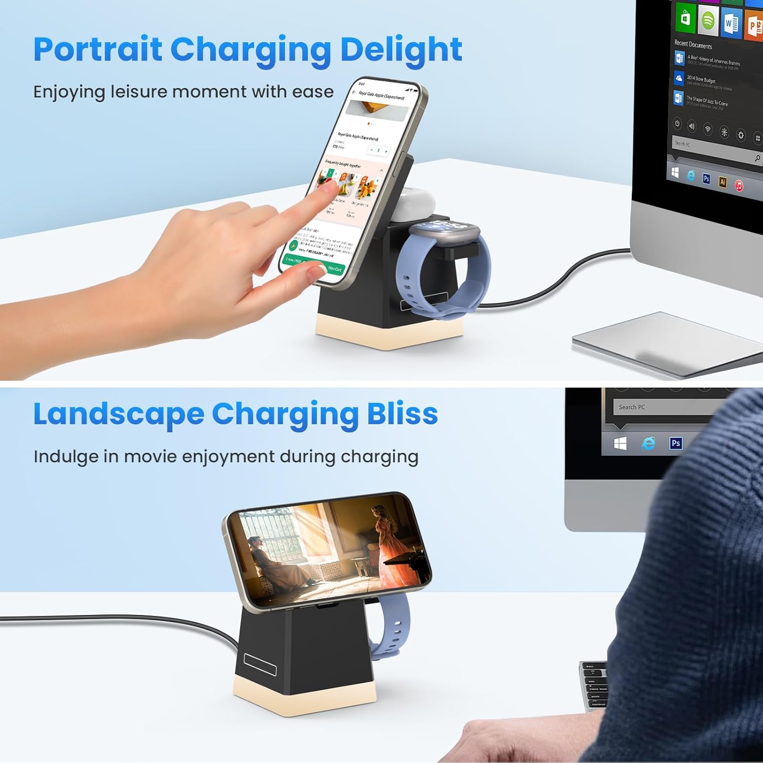 • ВАШАТА НАЙ-ДОБРА 3 В 1 БЕЗЖИЧНА ЗАРЯДНА СТАНЦИЯ Омръзна ли ви да жонглирате с множество зарядни устройства за вашите джаджи? Не търсете повече! Нашето 3 в 1 безжично зарядно за Apple е цялостно решение за всички ваши устройства. От сериите iPhone Air/17/16/15/14/13/12/11/X/8 до Apple Watch 10/9/8/7/6/5/4/3/2/Ultra/SE 2/SE 1 и AirPods 4/Pro 2/Pro/3/2 (безжична версия), всичко е включено. Безжичната зарядна станция JoyGeek е многофункционална и е проектирана да ви улесни живота!