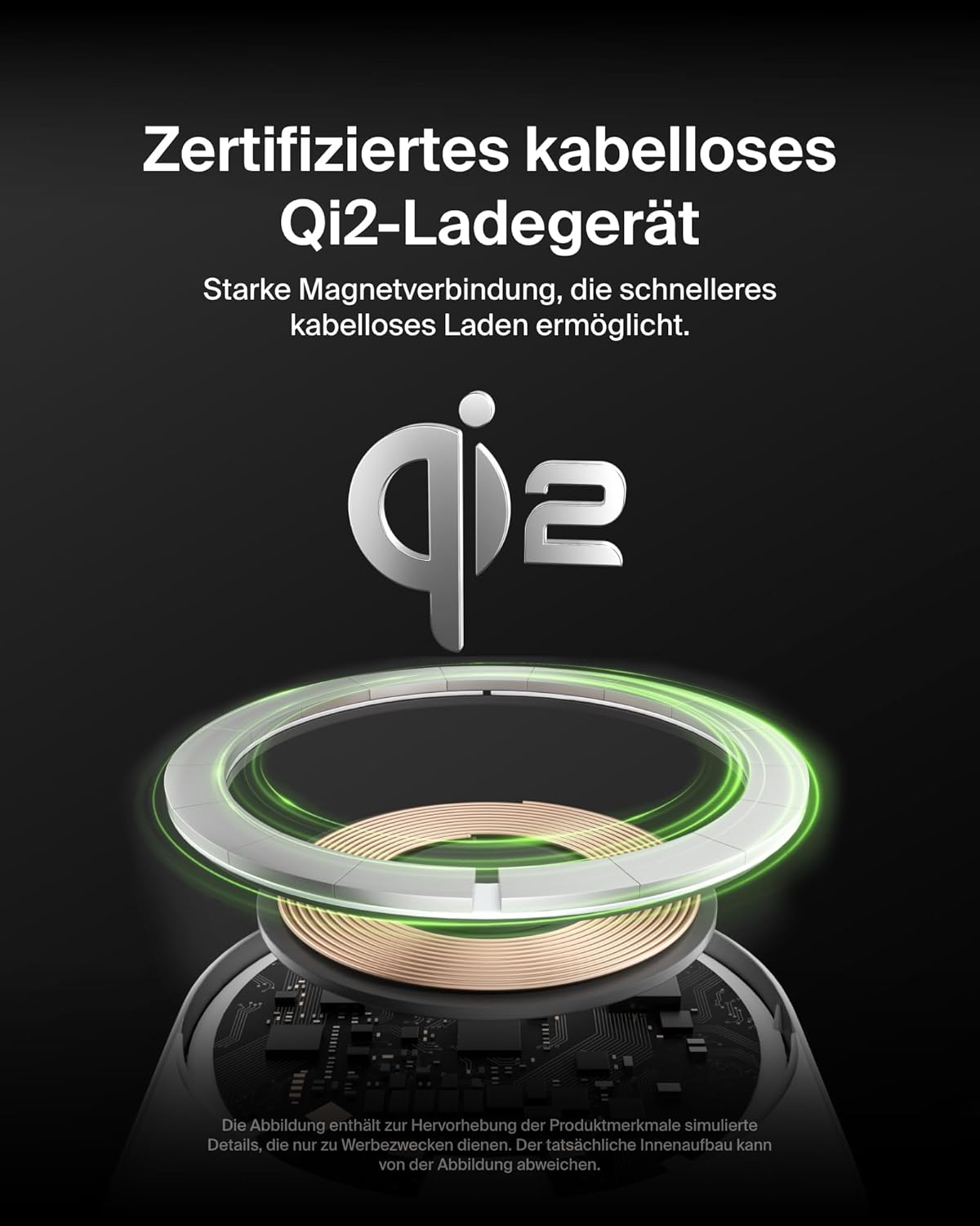 • БЪРЗО ЗАРЕЖДАНЕ С Qi2 ТЕХНОЛОГИЯ: Трябва само да поставите вашия iPhone или друго Qi2 съвместимо устройство върху магнитния държач, за да го заредите бързо до 15W. С Qi2 можете да зареждате безжично до 2 пъти по-бързо.*