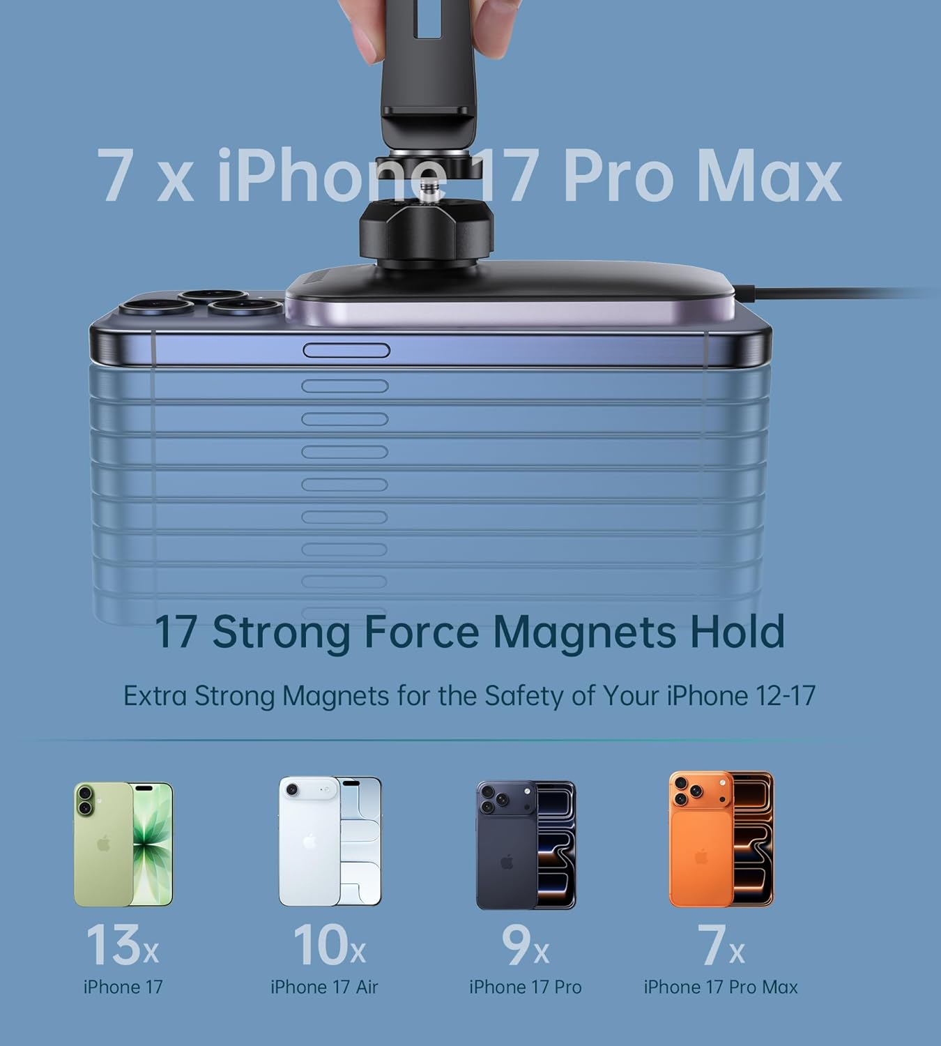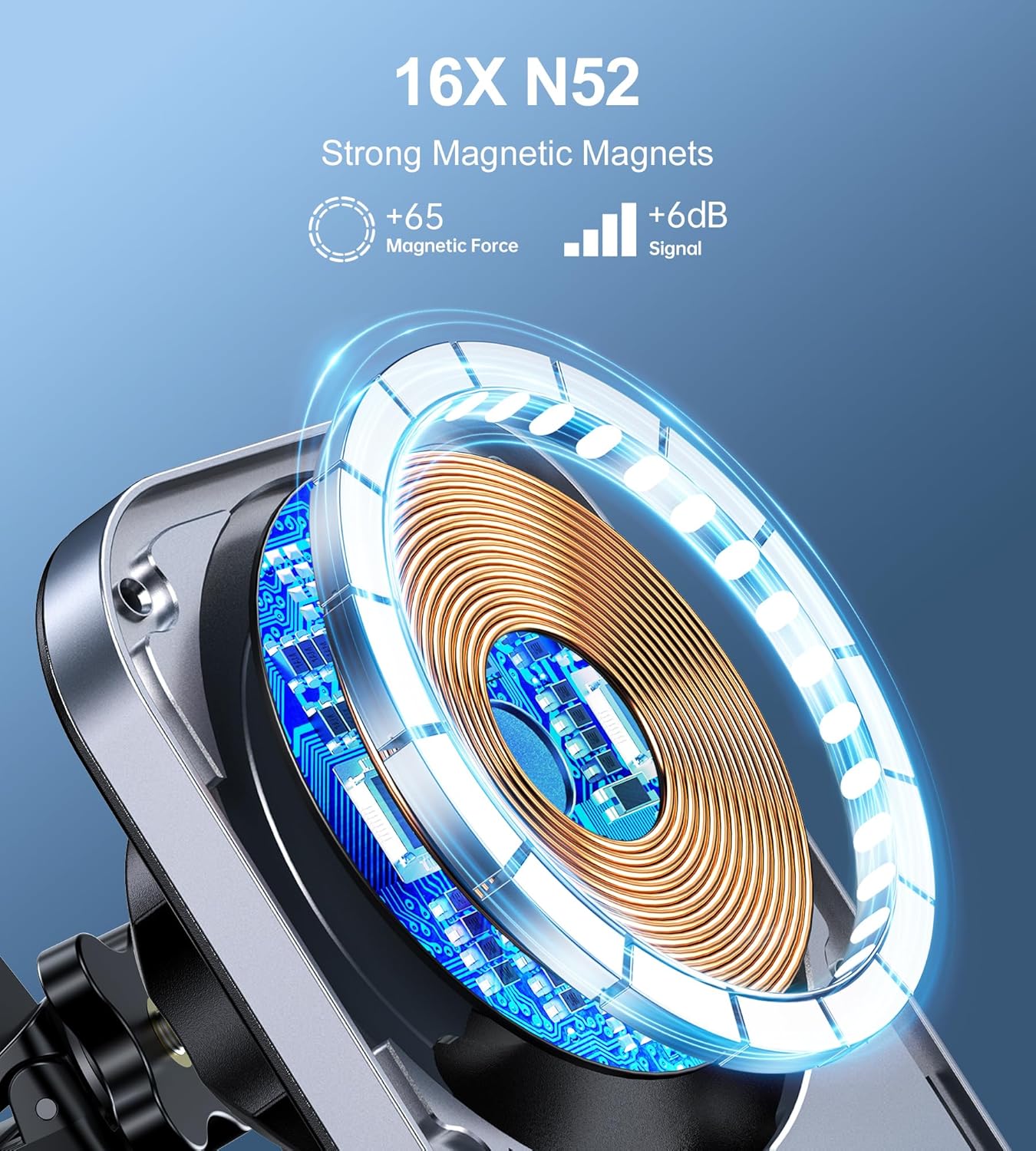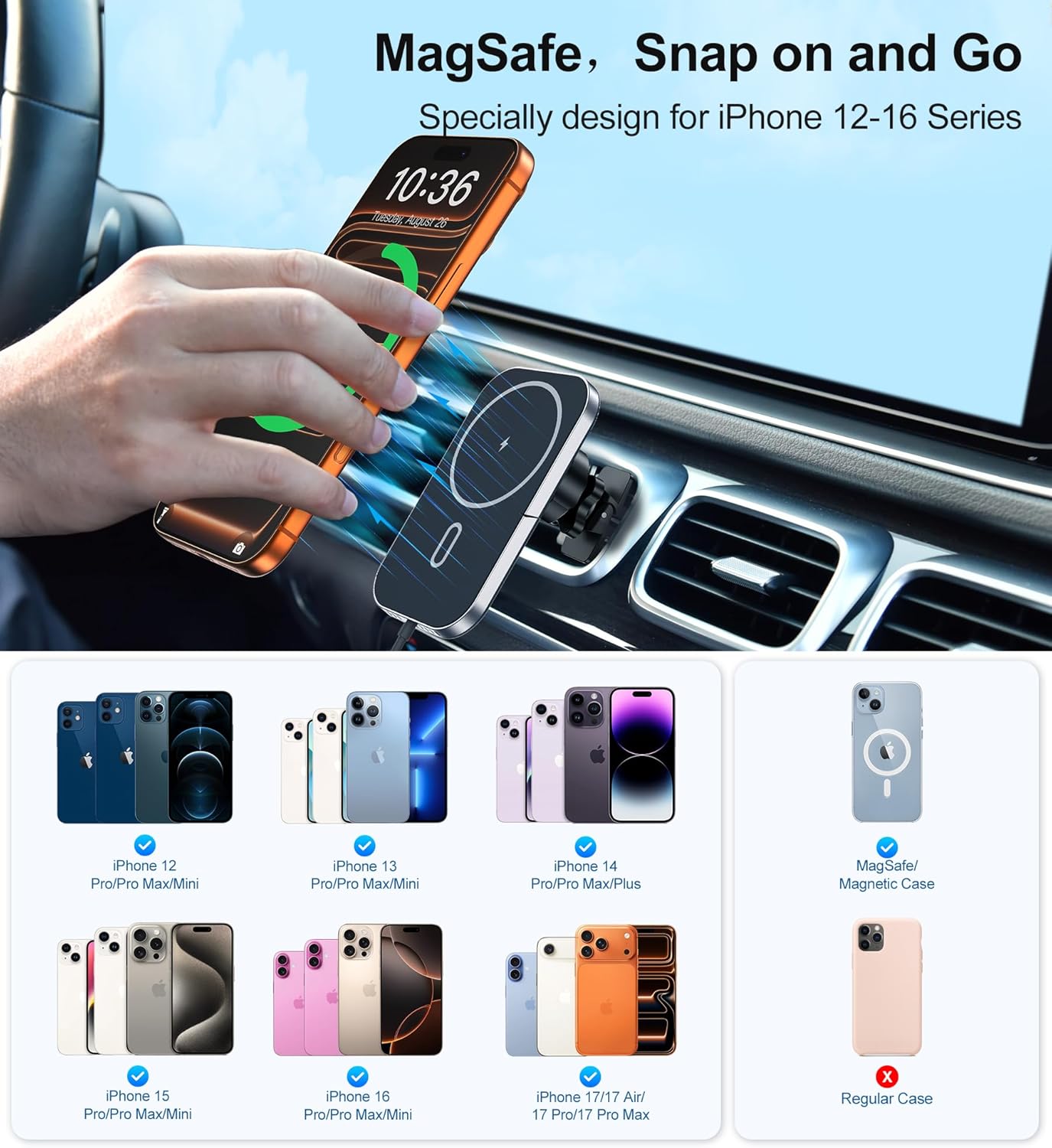 • 【Бързо магнитно зареждане】: тази вентилационна стойка за зарядно осигурява 30% по-бързо зареждане на вашия iPhone серия 16/15/14/13/12 в сравнение със стандартните безжични зарядни за кола, по-малко от 3,5 часа за пълно зареждане от 0 до 100%.