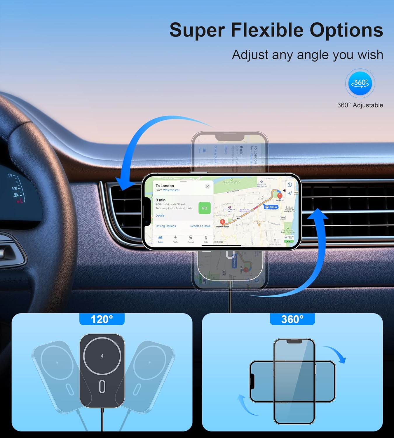 BHBHB 15 W Магнитен безжичен държач за мобилен телефон, зарядно за кола, съвместим с държача за кола Mag-Safe за вентилационни отвори, бързо зарядно, безжично зарядно, въртящ се на 360°, подходящ за iPhone 16/15/14/13/12 Pro Max Plus