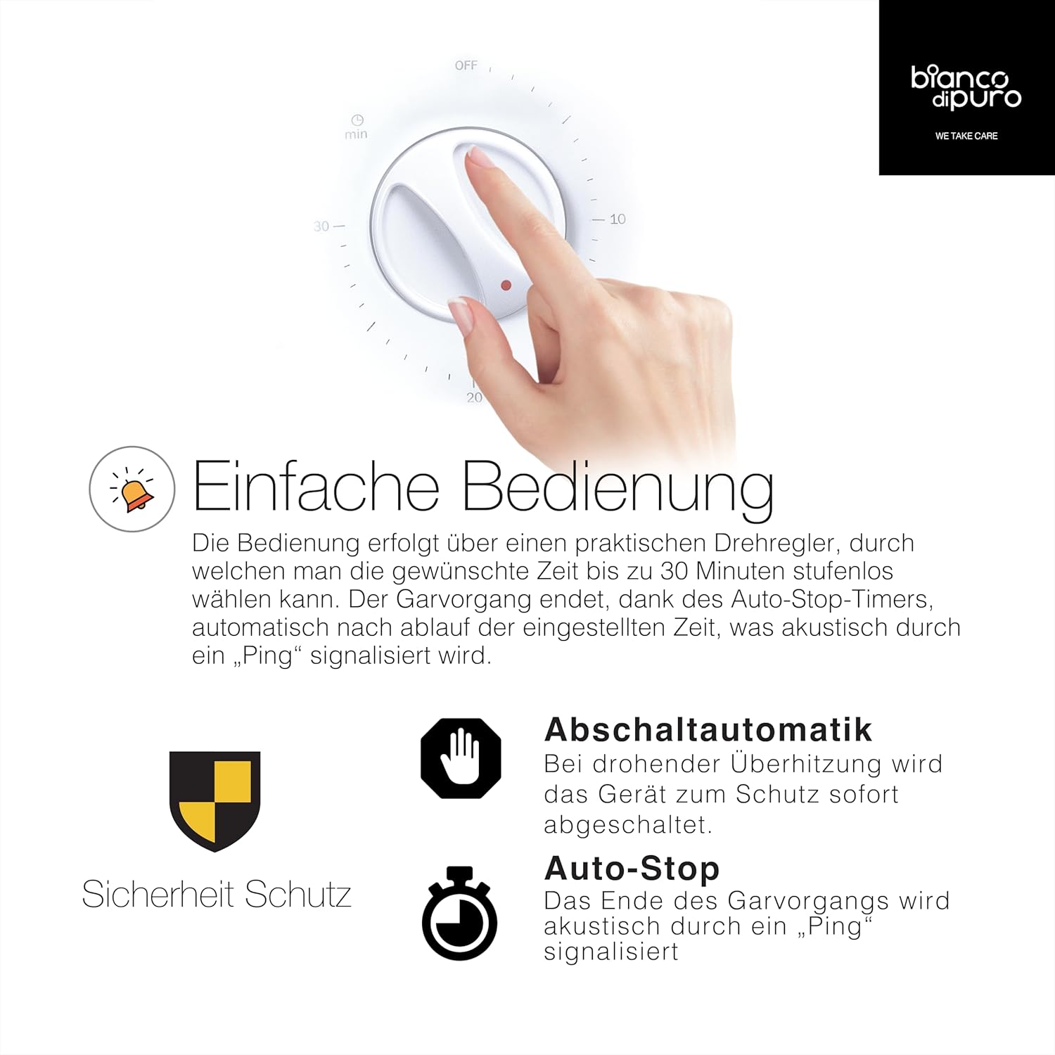 • Лесен за употреба: с въртящия се превключвател може да се избере време за готвене до 30 минути. Функцията за автоматично спиране със звуков сигнал автоматично спира процеса на готвене на пара.