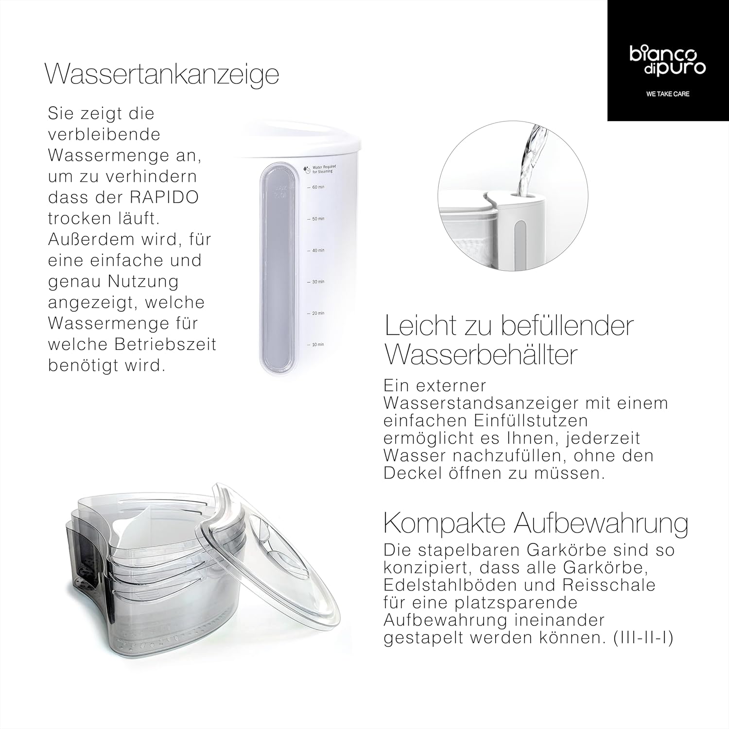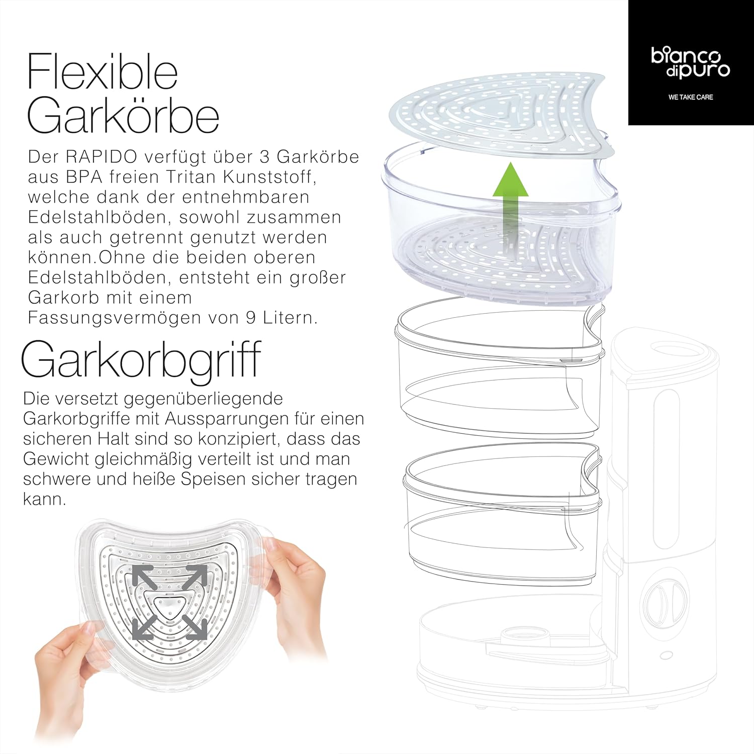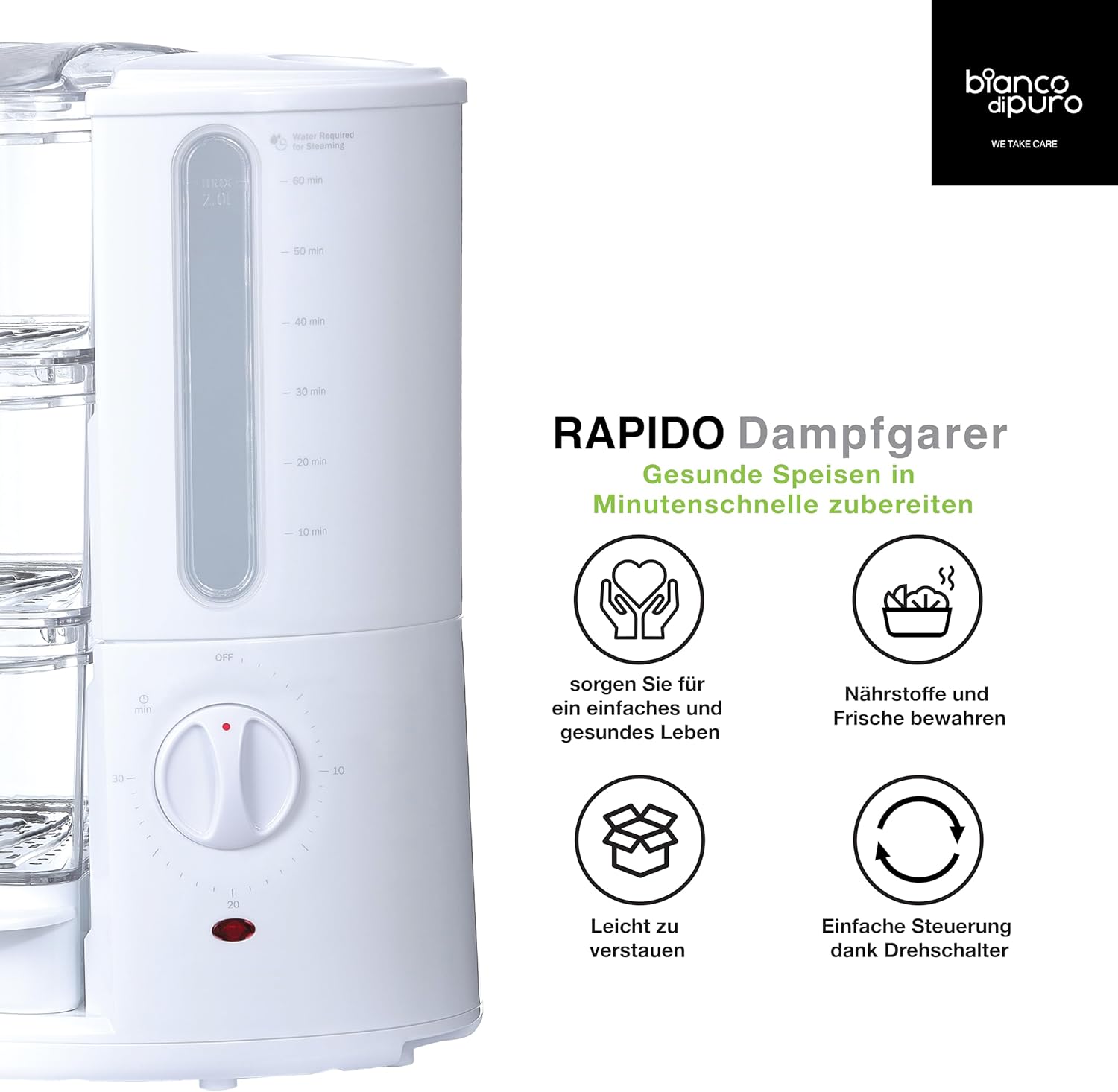bianco di puro® Rapido Steamer - 50% по-бърз от други системи благодарение на STRIX Steam Technology с основи от неръждаема стомана - Без BPA - 30-минутен таймер с автоматично спиране - 9 л променлив обем за готвене