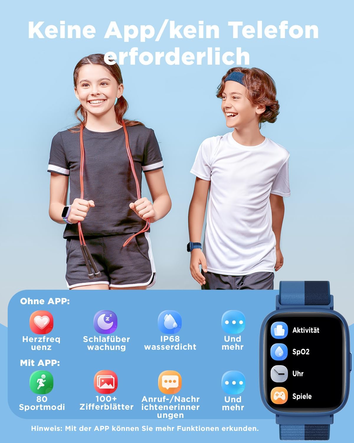 BIGGERFIVE Смарт часовник за деца, 1.8 инча фитнес часовник с крачкомер, 24/7 пулс, водоустойчивост IP68, монитор за сън, будилник, 5 пъзел игри със/без приложение, фитнес тракер за момичета, момчета, тийнейджъри 5-16 години, найлон