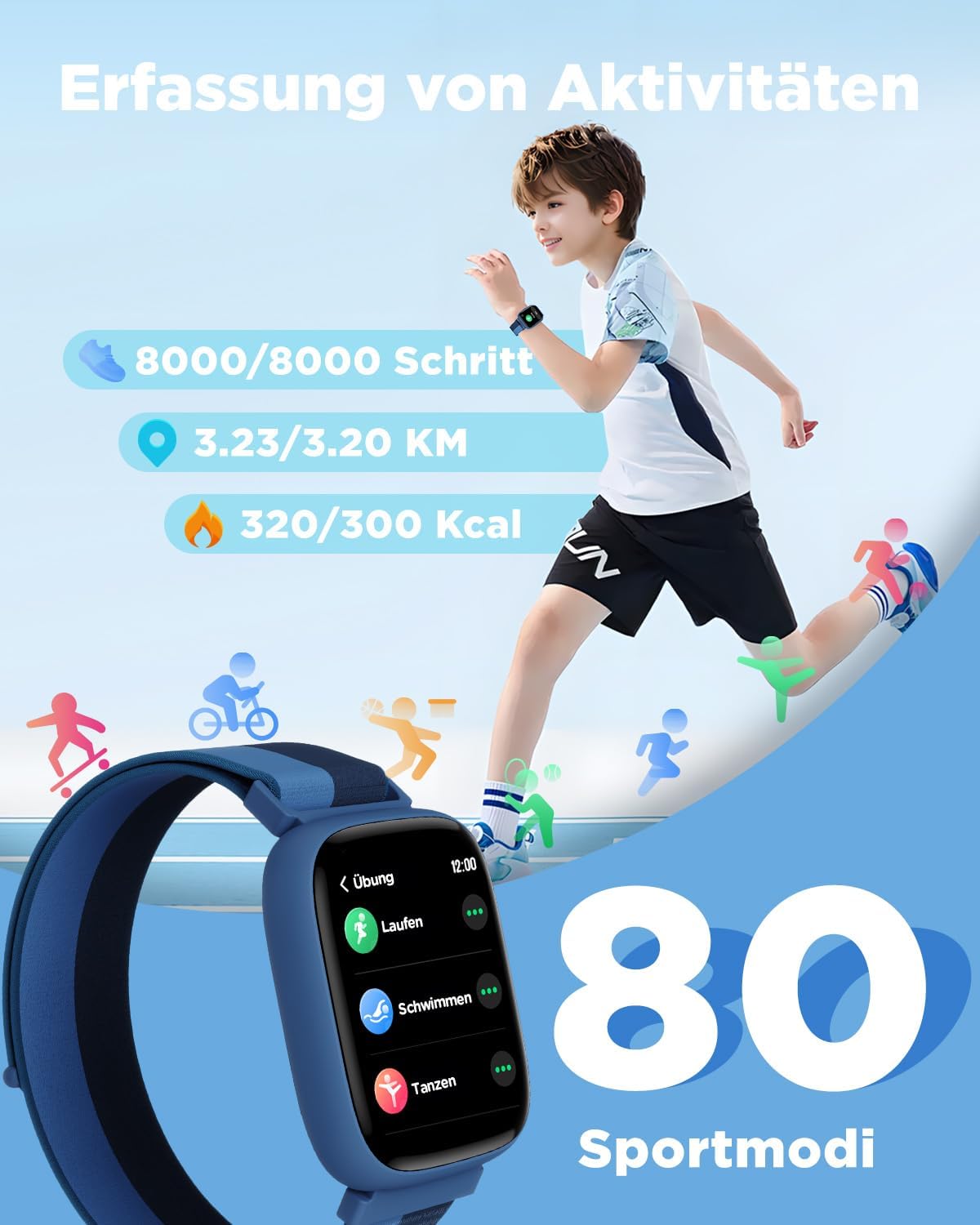 • ПРОСЛЕДЯВАНЕ НА АКТИВНОСТТА ПРЕЗ ЦЕЛИЯ ДЕН Умният часовник BIGGERFIVE BRAVE 2 за деца и тийнейджъри автоматично брои крачки, разстояние, изгорени калории и активни минути. Поддържа 80 спортни режима, като ходене, бягане, колоездене, баскетбол и други.