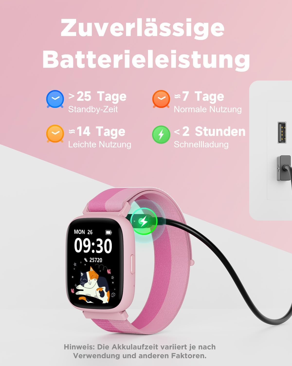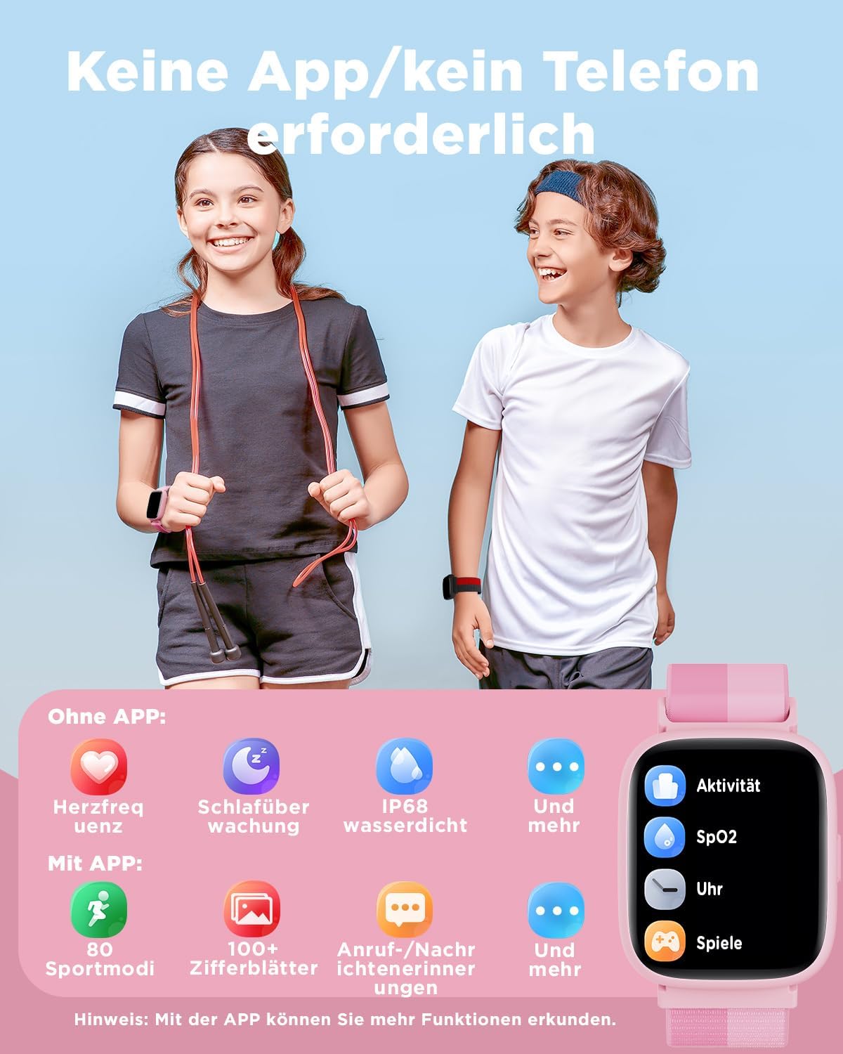 BIGGERFIVE Смарт часовник за деца, 1.8 инча фитнес часовник с крачкомер, 24/7 пулс, водоустойчивост IP68, монитор за сън, будилник, 5 пъзел игри със/без приложение, фитнес тракер за момичета тийнейджъри 5-16 години, найлон