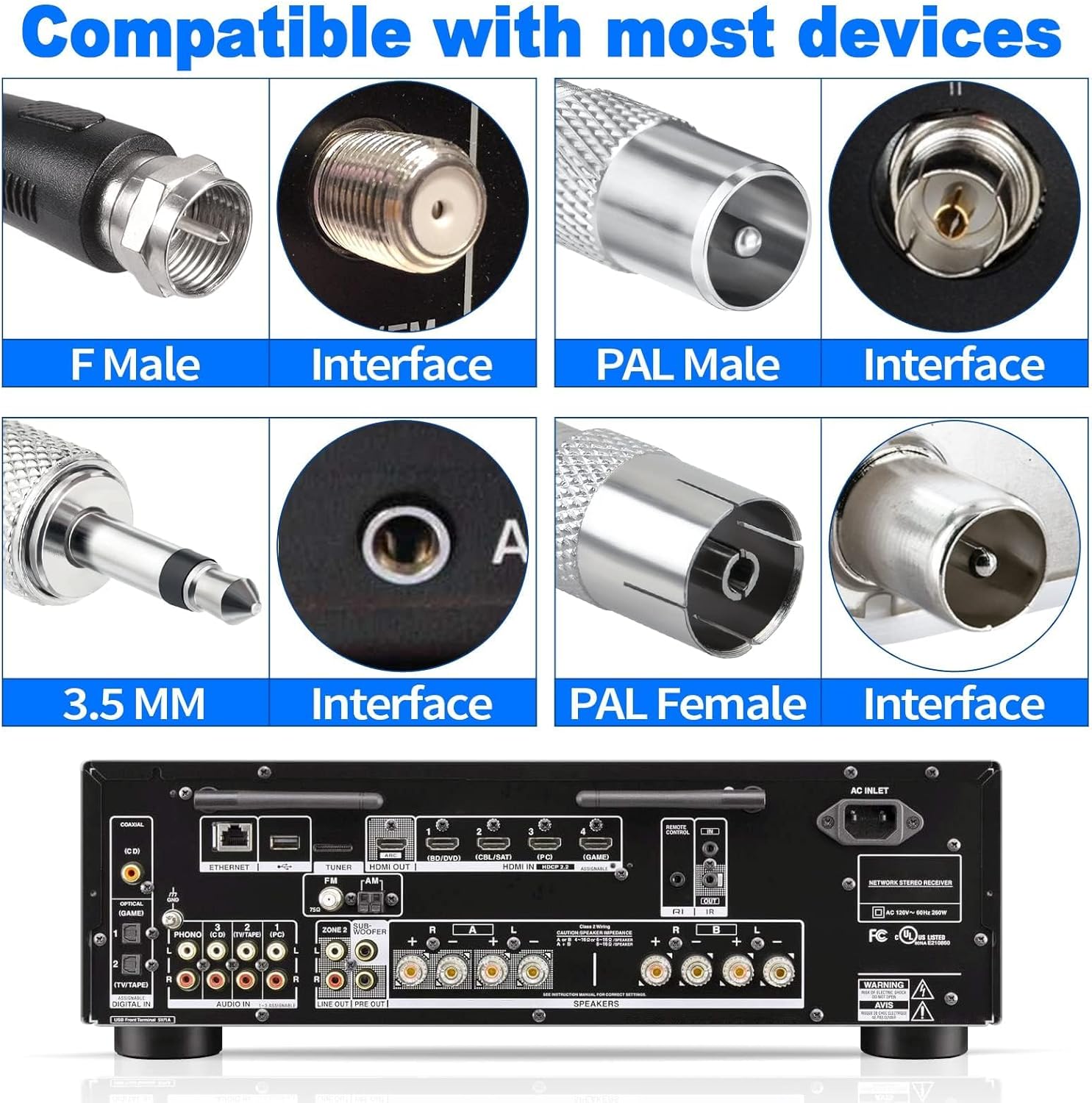 • Универсална съвместимост Съвместим с Yamaha, JVC, Sherwood, Pioneer, Panasonic, Onkyo, Sony, вътрешни радиостанции, домашно стерео аудио видео приемници.