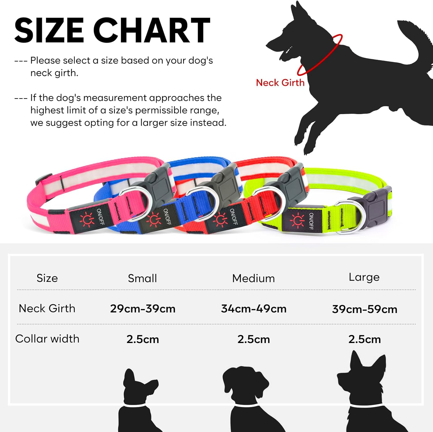 • 【Регулируем светещ нашийник】Този LED нашийник е с регулируема дължина, за да е подходящ за растящи кучета. Можете да го използвате дори за други животни като овце, елени или понита. Моля, проверете таблицата с размери преди да поръчате, за да сте сигурни, че пасва перфектно на вашия домашен любимец!