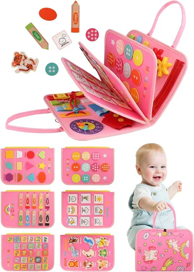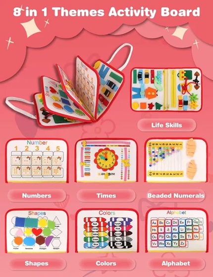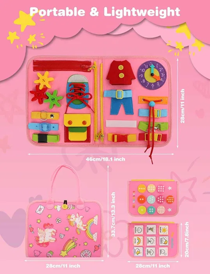Бизиборд представлява сгъваема мека дъска с много различни дейности, предназначена да помогне на детето да експерементира и да придобие знания и умения чрез игра и забавления.