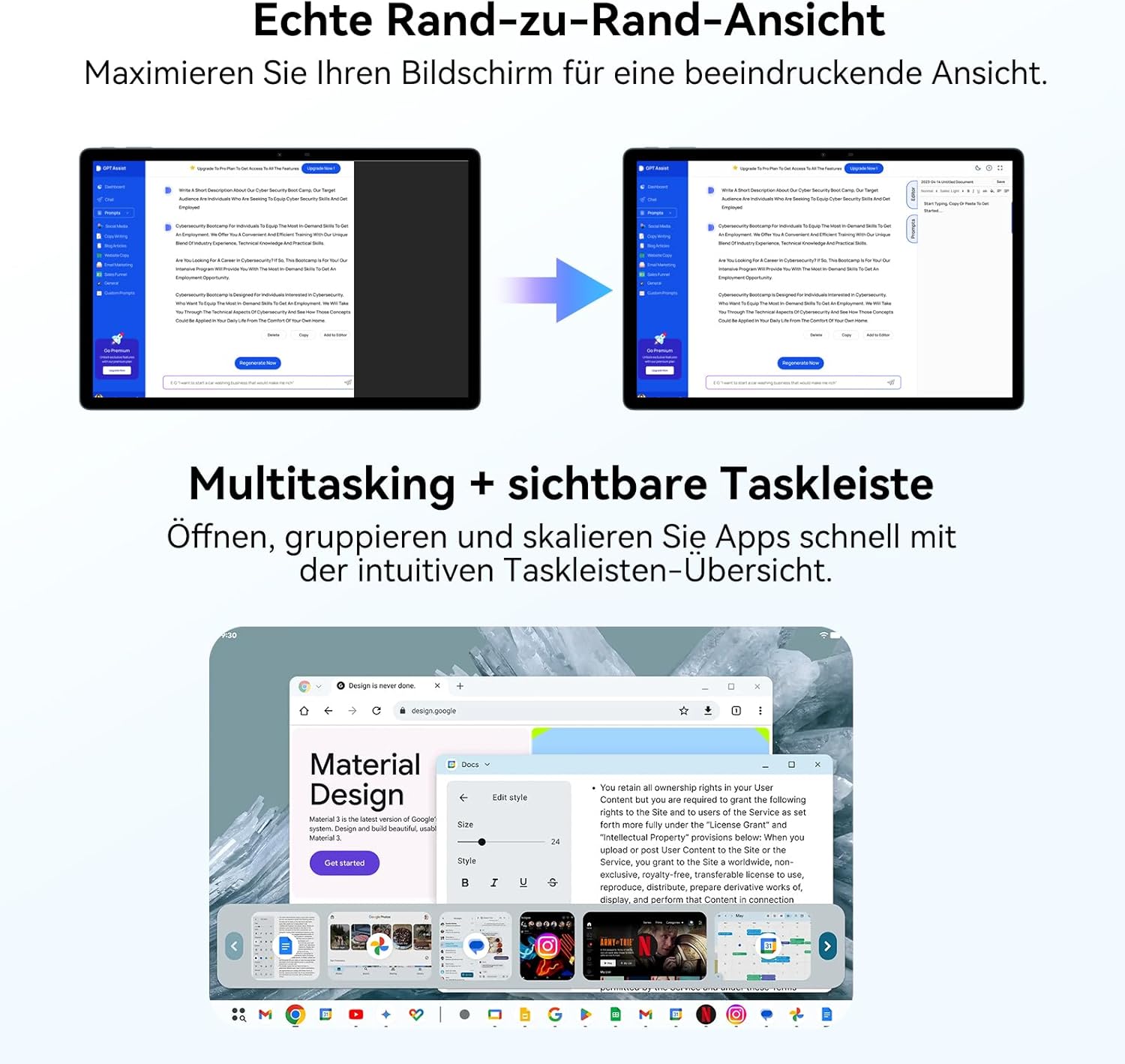 • 【Батерия 11 000 mAh + 4 високоговорителя + GPS】С мощна батерия от 11 000 mAh, таблетът Android 16 предлага изключителна издръжливост за часове употреба – идеален за работа, игри или стрийминг. Благодарение на бързото зареждане от 18 W, батерията се зарежда бързо. Четири мощни високоговорителя осигуряват кинематографично звуково изживяване, а GPS осигурява прецизна навигация в движение.