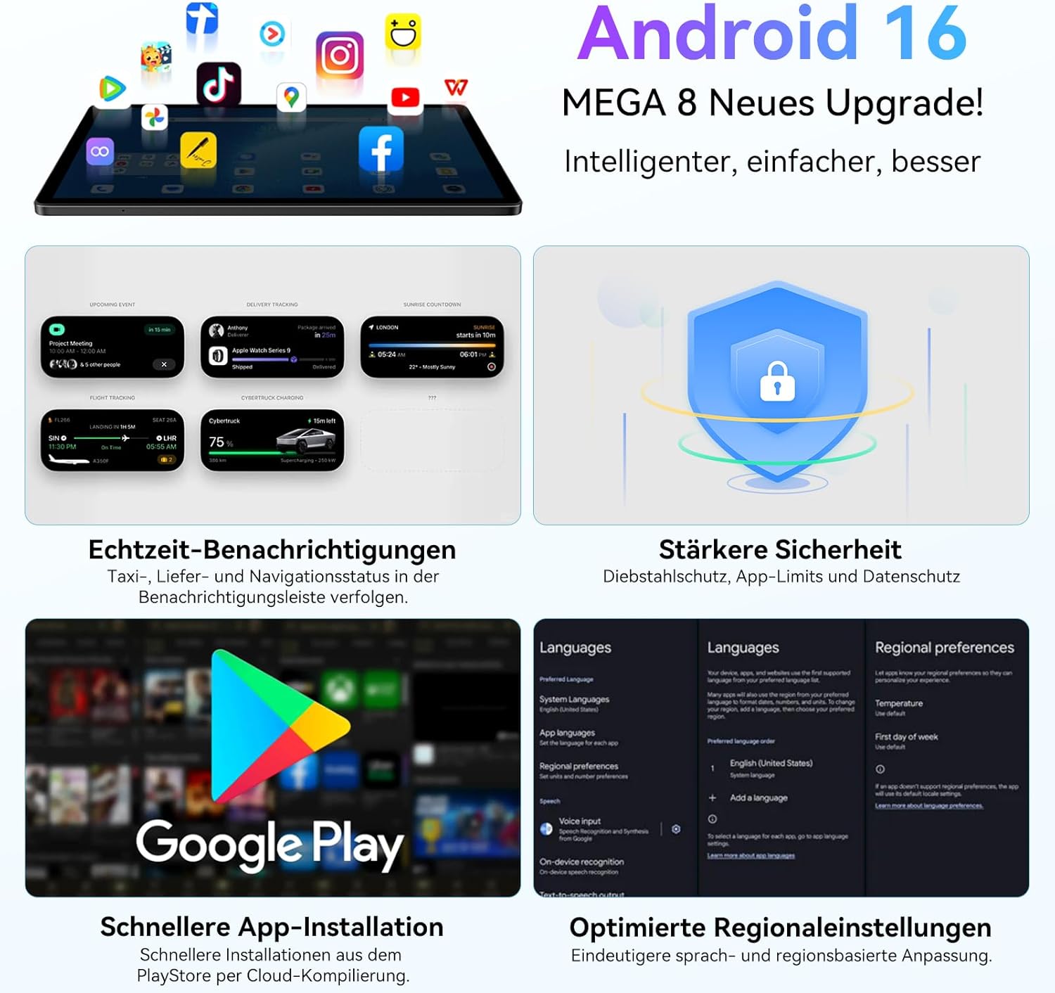 • 【Таблет с Android 16 + операционна система DOKE OS】Таблет Blackview MEGA8 с Android 16 – вашият надежден спътник за работа, забавление и още! С модерната операционна система Android 16 и удобния за потребителя интерфейс DOKE OS, този таблет ви предлага плавно и интуитивно потребителско изживяване.