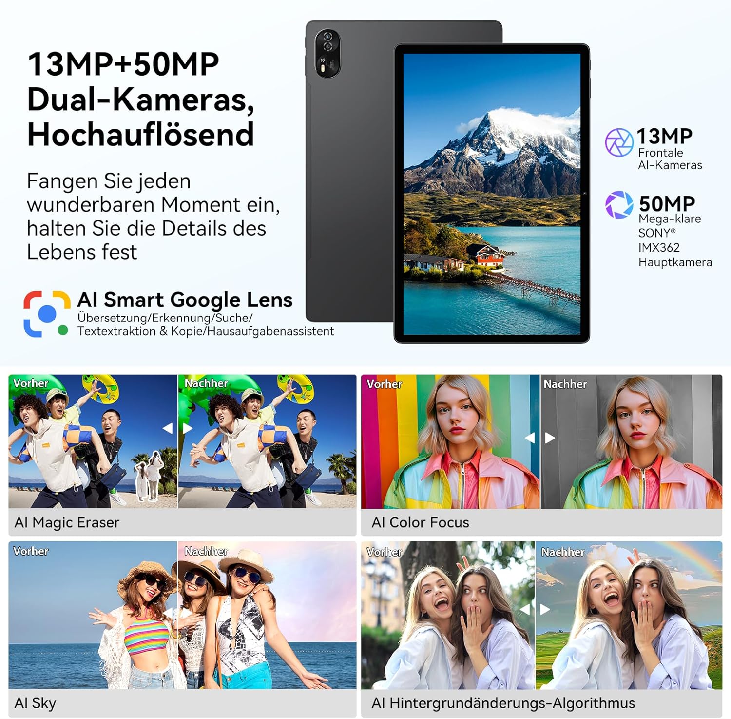 • 【13-инчов голям дисплей + 50 MP двойна камера】Таблетът Blackview MEGA8 Android 16 впечатлява с брилянтен 13-инчов голям дисплей с Full HD+ резолюция (1920 x 1200). Честотата на опресняване от 90Hz осигурява плавно превъртане, изключително ясни изображения и впечатляващо мултимедийно изживяване – идеален за работа, забавление и творчески проекти. Като мощен 13-инчов таблет, той разполага и с 50+13 MP двойна камера, която осигурява ясни снимки с точно възпроизвеждане на цветовете, оптимизирана яркост, контраст и детайли – дори при слаба светлина.