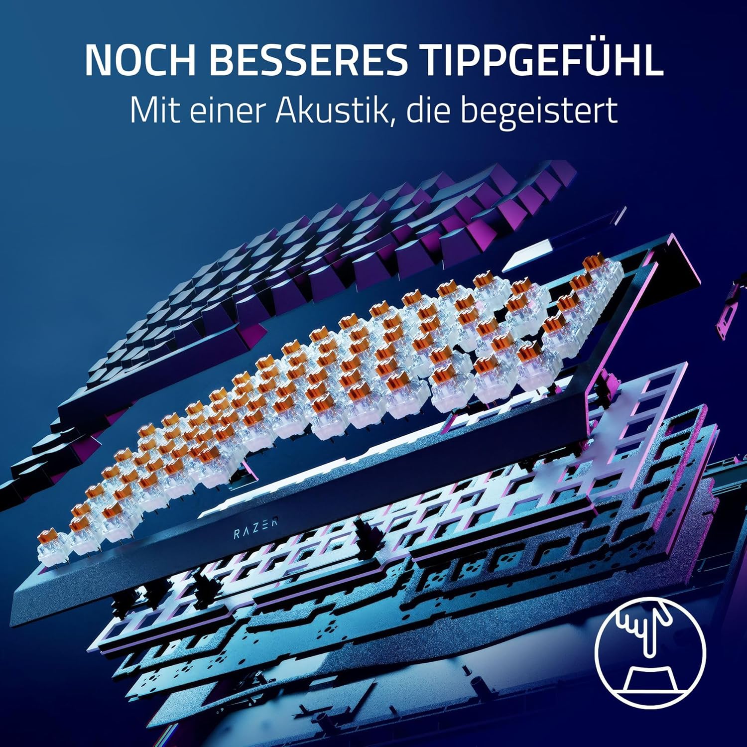 • Двустранно осветление на долната част и осветление на всеки клавиш, задвижвано от Razer Chroma RGB: Осветлението на всеки клавиш и хипнотизиращото осветление на долната част осветяват клавиатурата от още повече ъгли, перфектно синхронизирани с вашата Battle Station за още по-голямо потапяне в стотици поддържани игри.