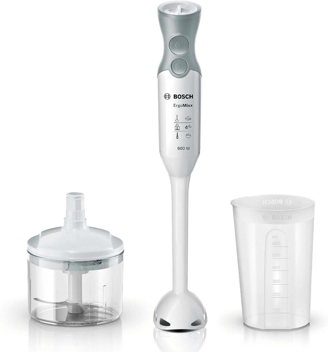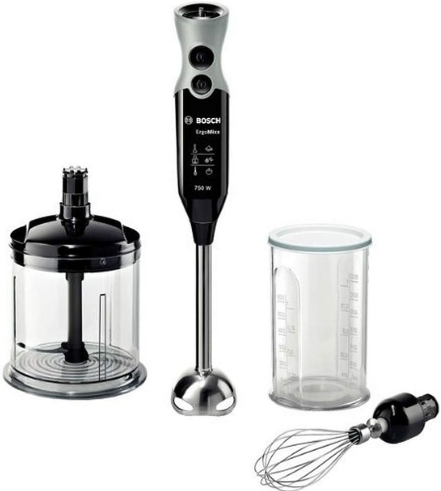 • Съдържание на кутията: 1 x ръчен пасатор Bosch ErgoMixx от неръждаема стомана, 2 x капака, 1 x шейкър/чаша, 1 x ръчен миксер, 1 x универсален чопър/миксер със 750 вата, цвят: черно/сив