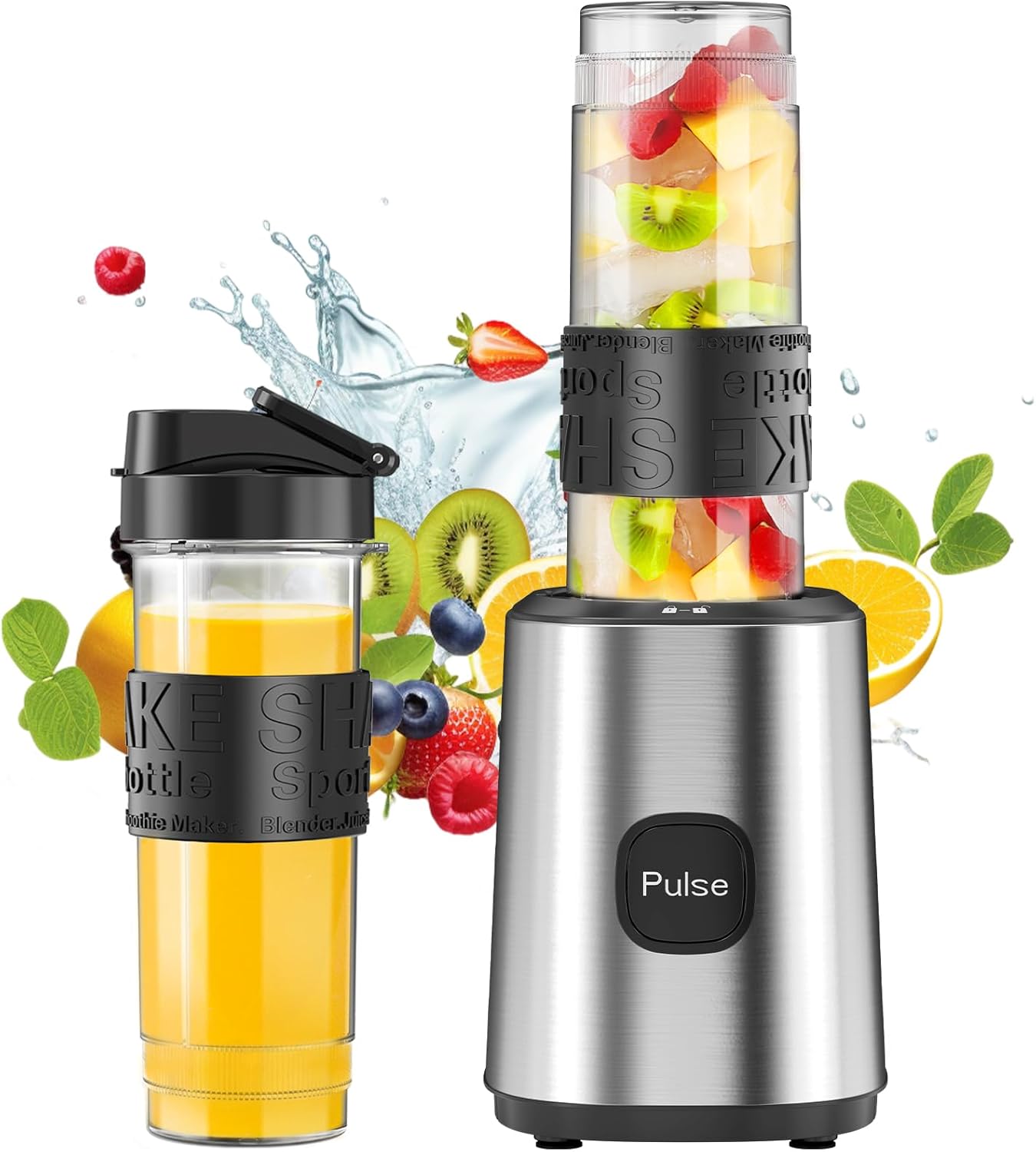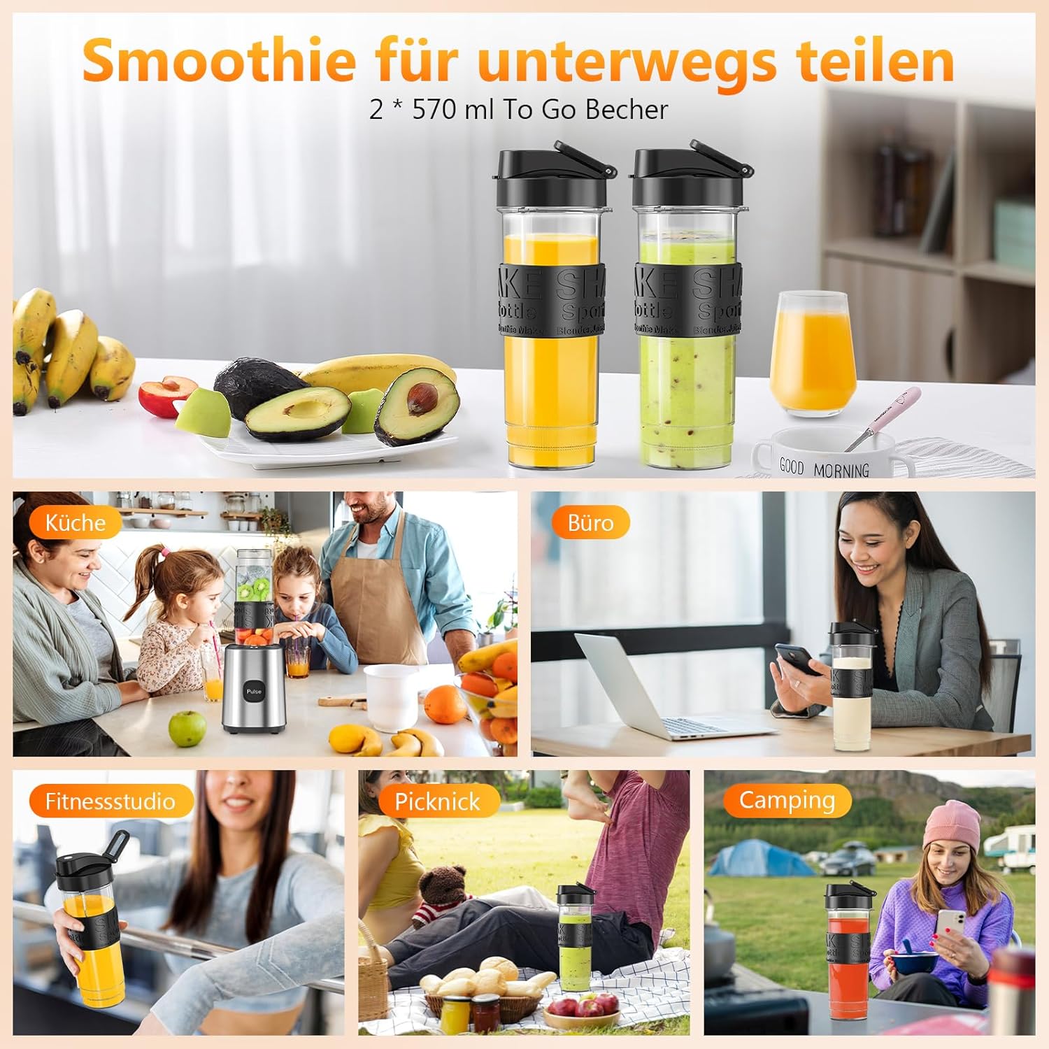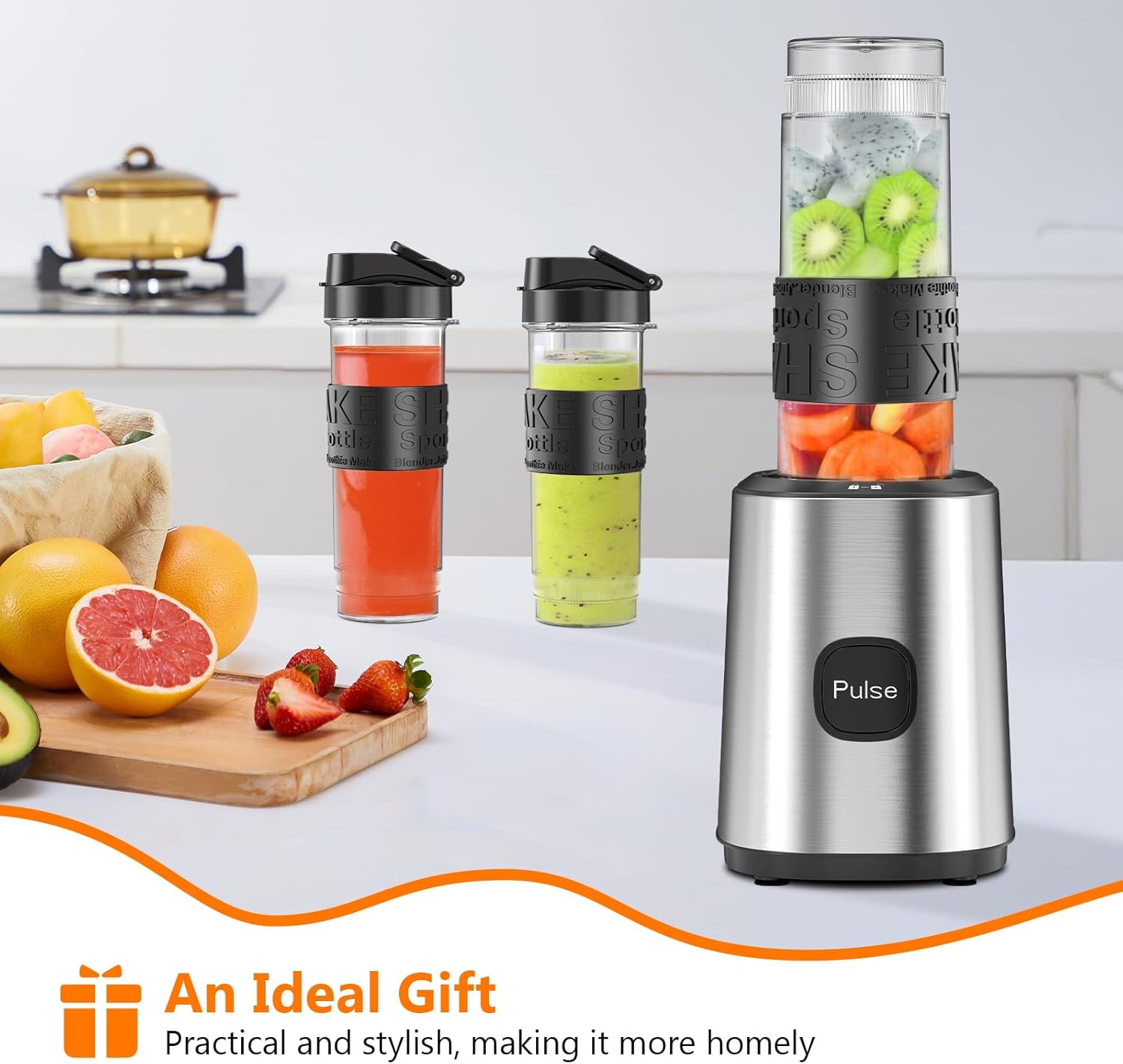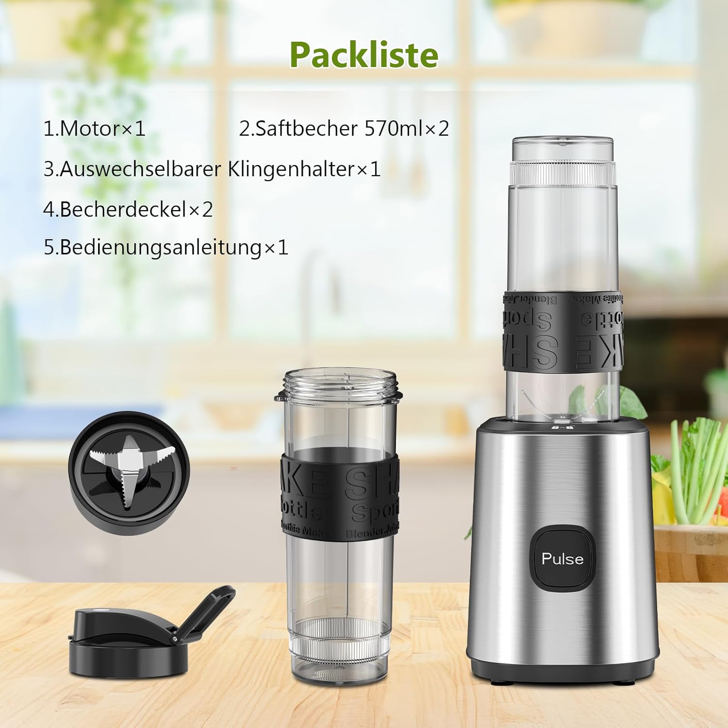 Блендер за смутита, 500 W миксер за смутита за вкъщи с 2 x 570 мл бутилки за смутита, Tritan без BPA, преносим блендер за смутита, изработен от неръждаема стомана, 4 листа за шейк, смути и бебешко брашно
