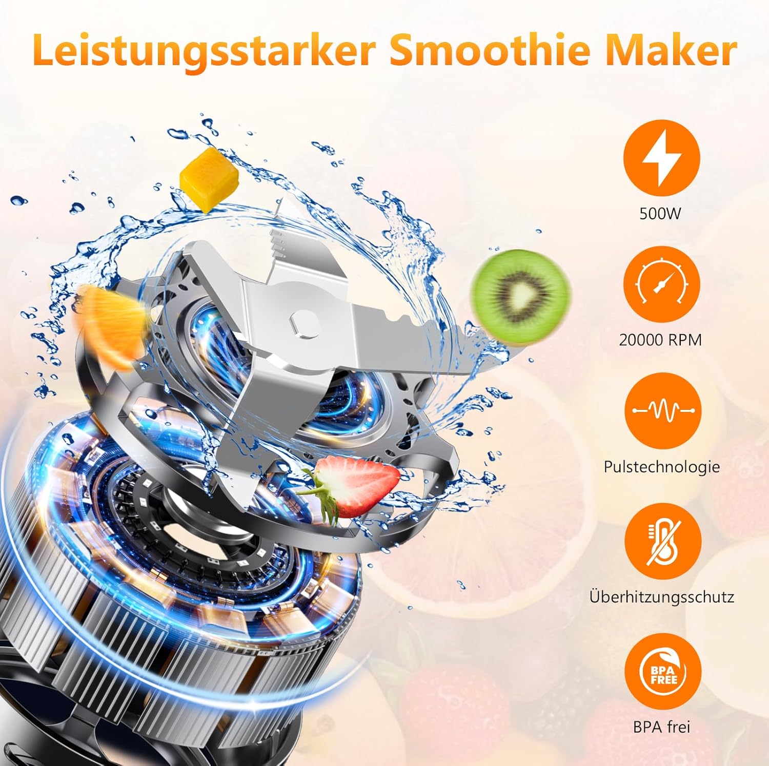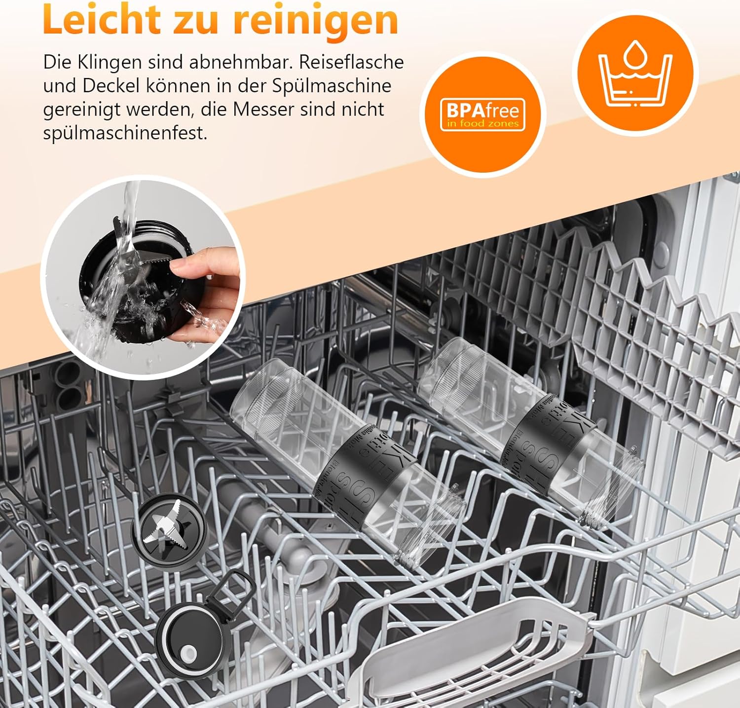 • 【Лесен за употреба и почистване】Този преносим смути мейкър се отличава с лесното си боравене и почистване: работата с един бутон прави смесването лесна задача. Бутилките за вода Tritan без BPA са без мирис, здрави и подходящи за съдомиялна машина, което ги прави лесни за почистване. Почистването на самия миксер също е много лесно: капка препарат и малко топла вода са всичко, от което се нуждаете – само за 10 секунди устройството е отново искрящо чисто.