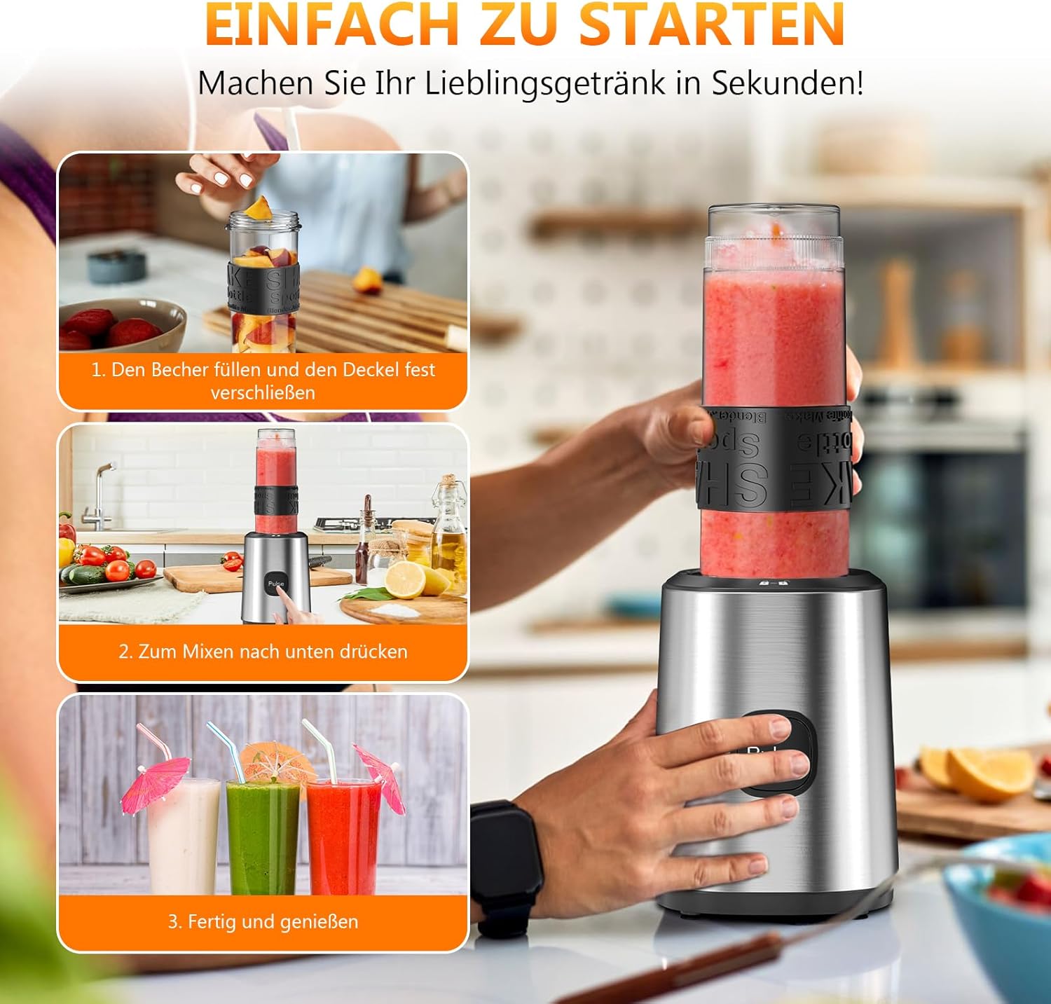 • Бърз и мощен уред за приготвяне на смутита: С мощен 500-ватов мотор и 20 000 оборота в минута, както и с 4 остри ножа от неръждаема стомана, този миксер постига оптимални резултати и приготвя вашите напитки само за 20 секунди. Той изпразва съставките на 100%, за да подобри вашето изживяване при пиене и да насърчи по-здравословен начин на живот.
