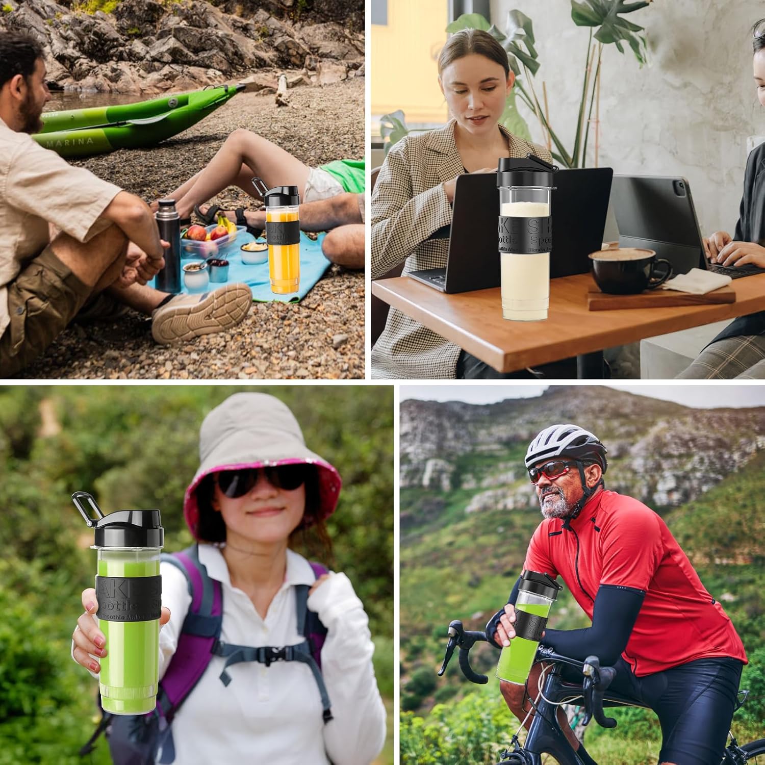 • Уред за смутита за из път: преносимият блендер е перфектното решение за всеки, който иска да се наслаждава на пресни смутита в движение. С двете си бутилки за вода от 20 унции и капаци, предпазващи от протичане, той предлага практичен и чист начин за безопасно транспортиране на домашно приготвени напитки. Блендерът е компактен и лек, което го прави идеален за фитнес зала, офис, училище, пътуване до работа, пътуване или къмпинг. Просто напълнете съставките, разбъркайте и вземете бутилката със себе си.