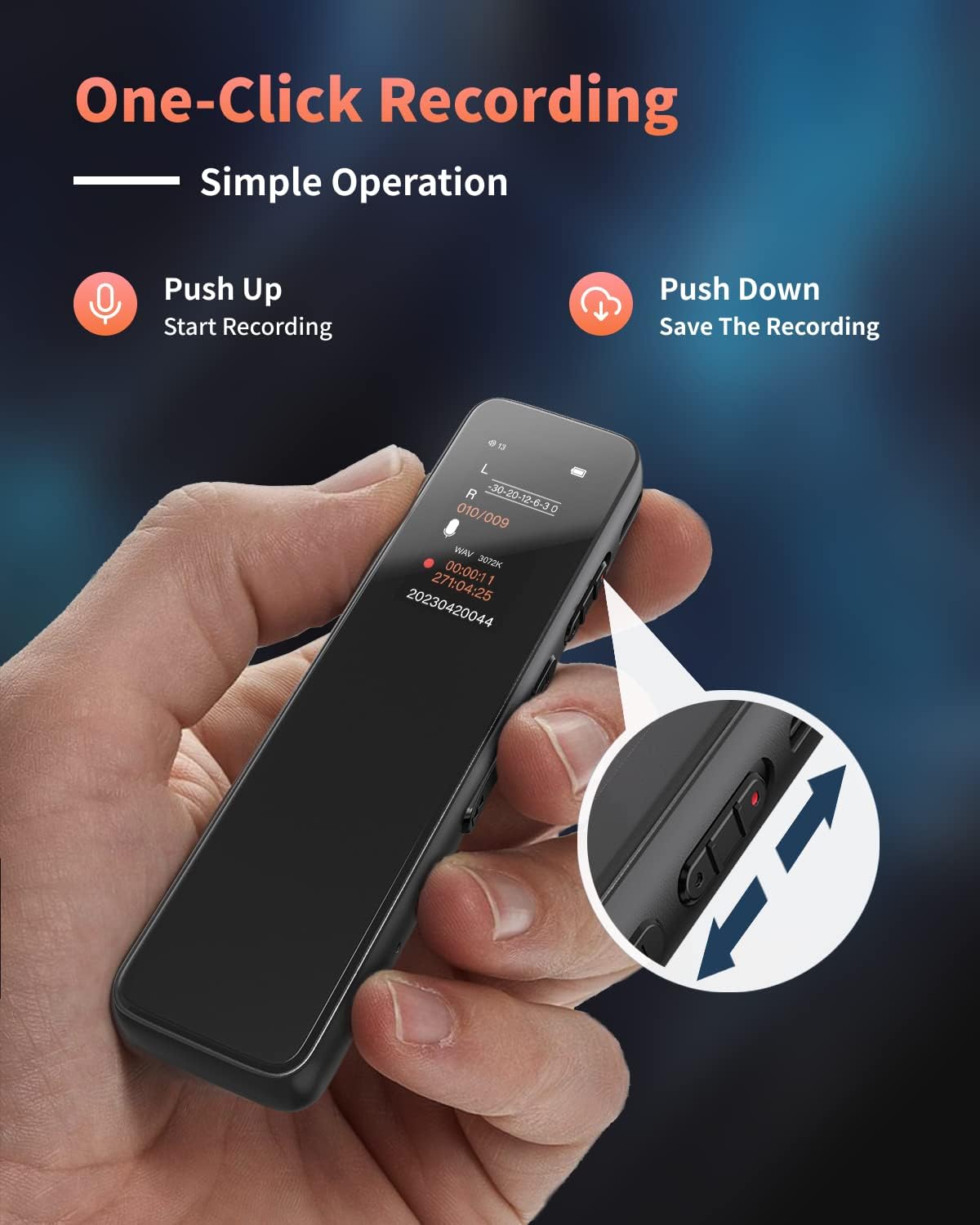 Recording with just one button: Intuitive user interface with special buttons for easy operation. Simply press up: start recording; press down: save recording.