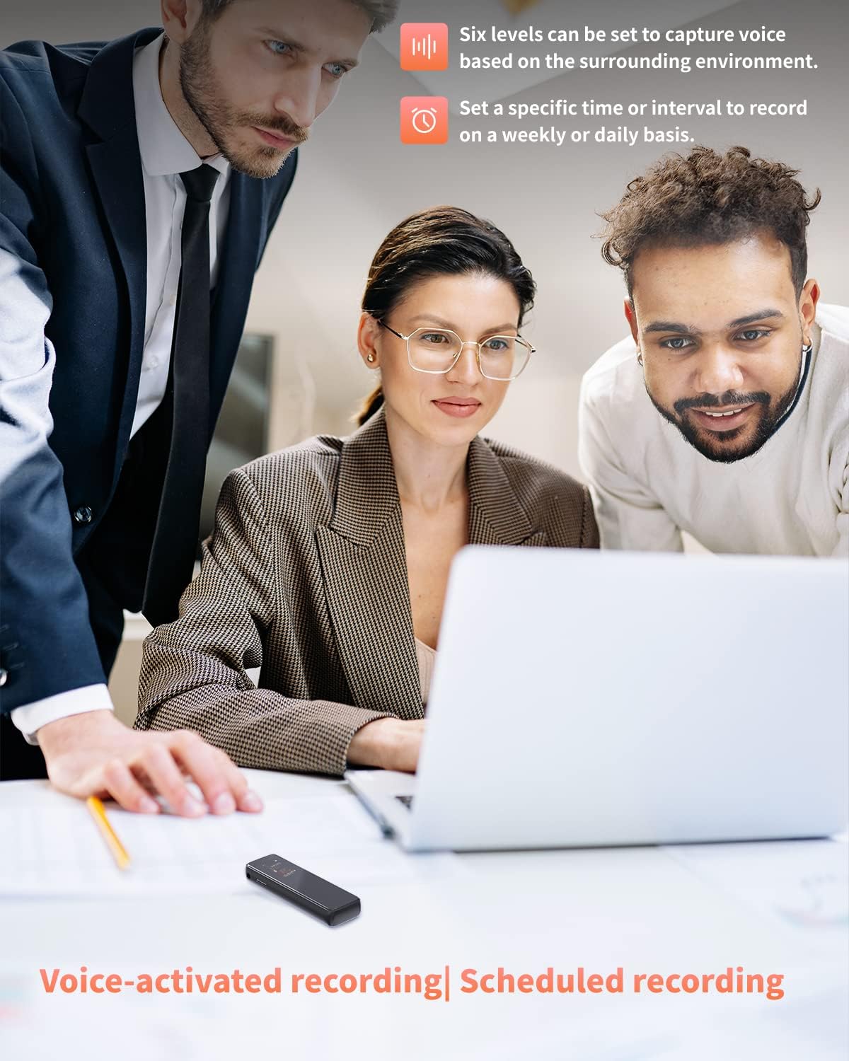 When this function is activated, the mini recorder automatically starts recording when the ambient noise reaches a certain decibel value, and stops recording when no noise is heard. This improves efficiency and saves storage space, playback time and battery power.