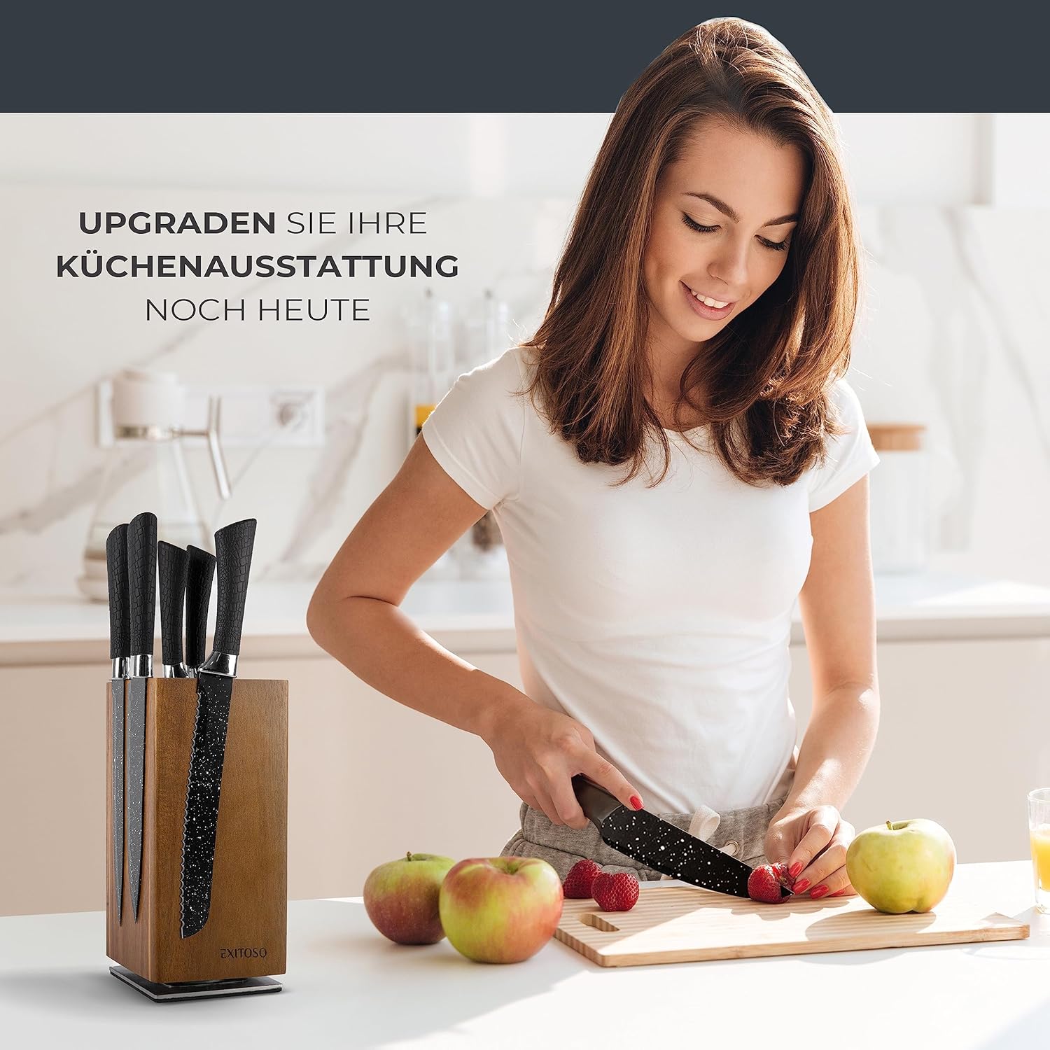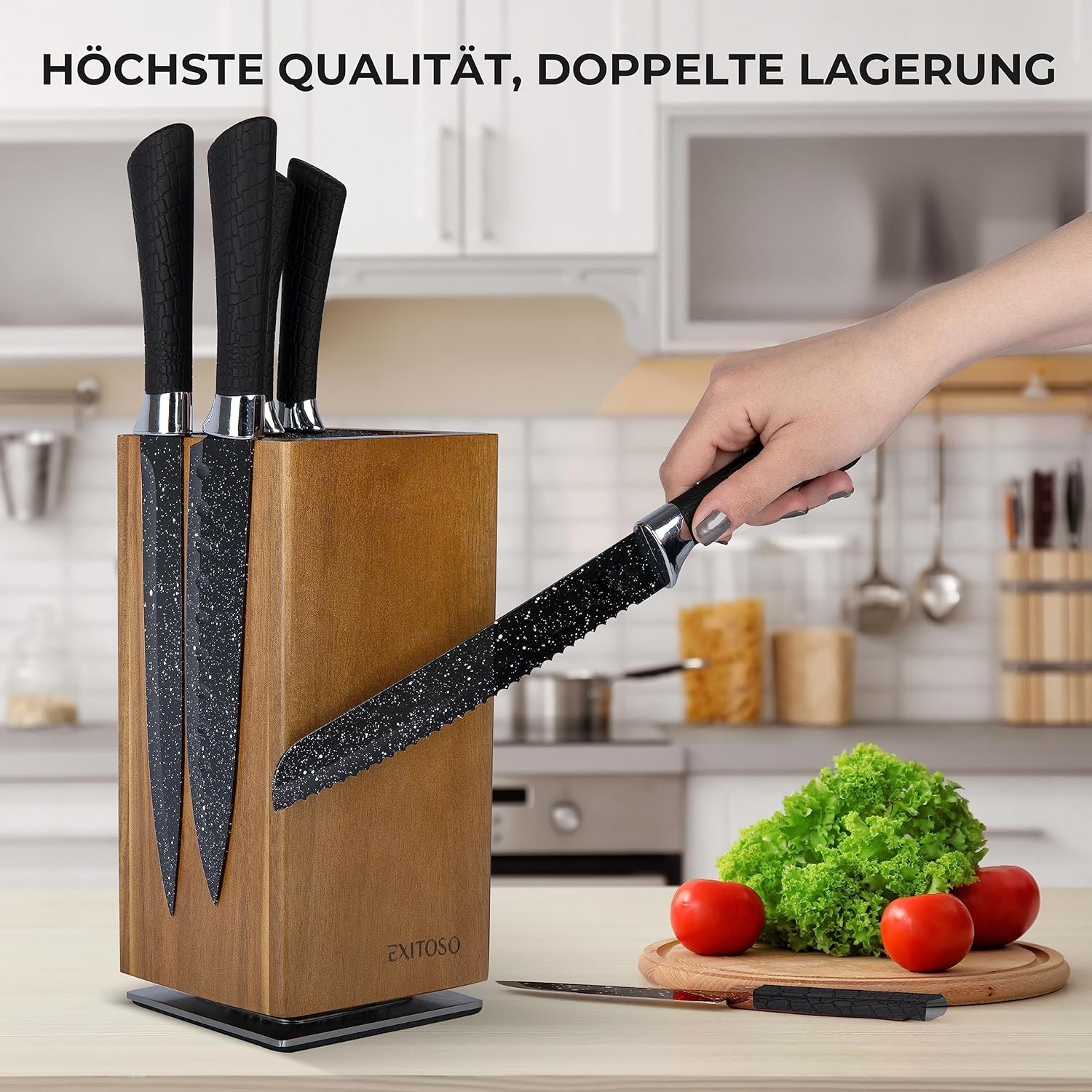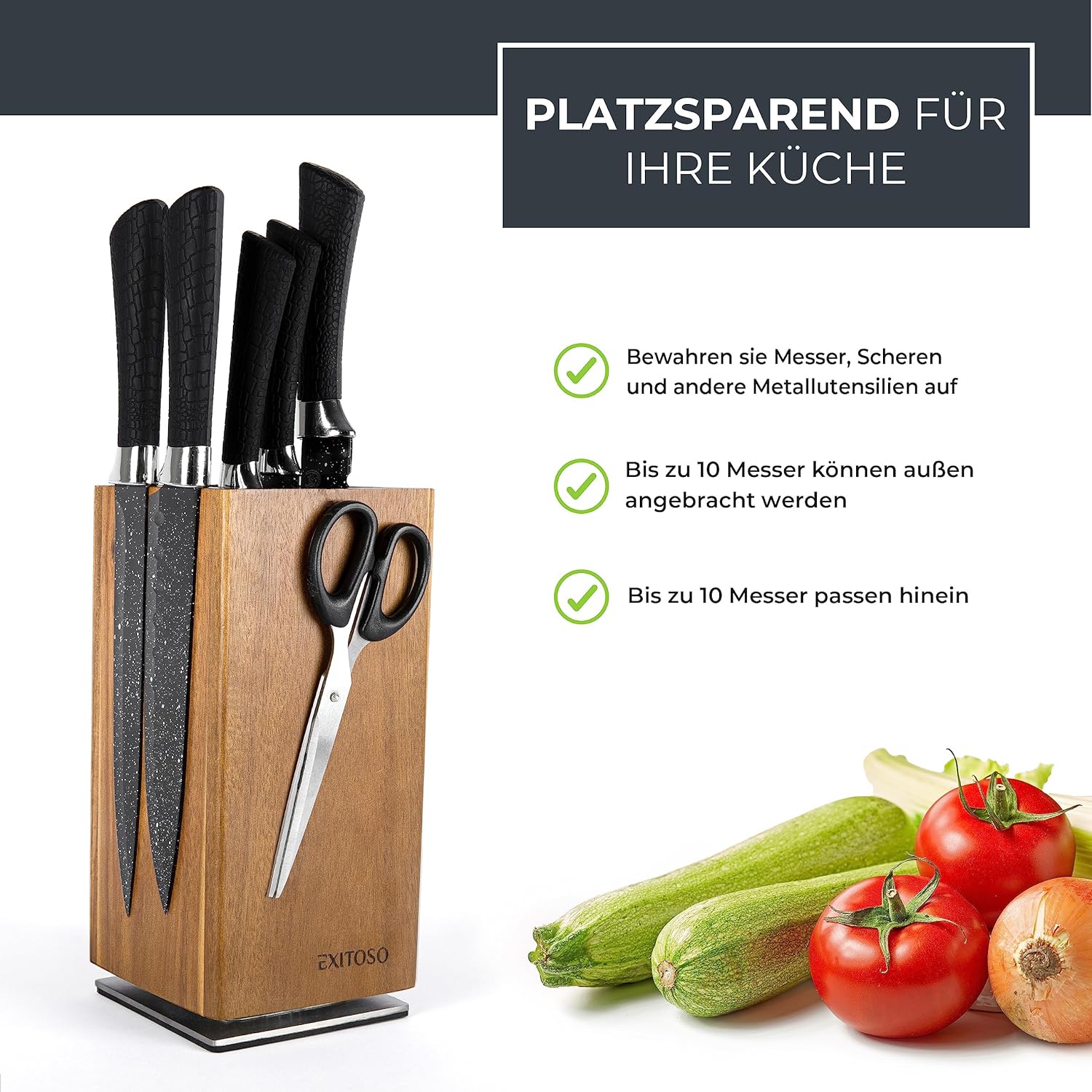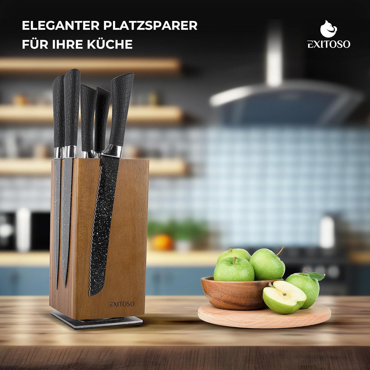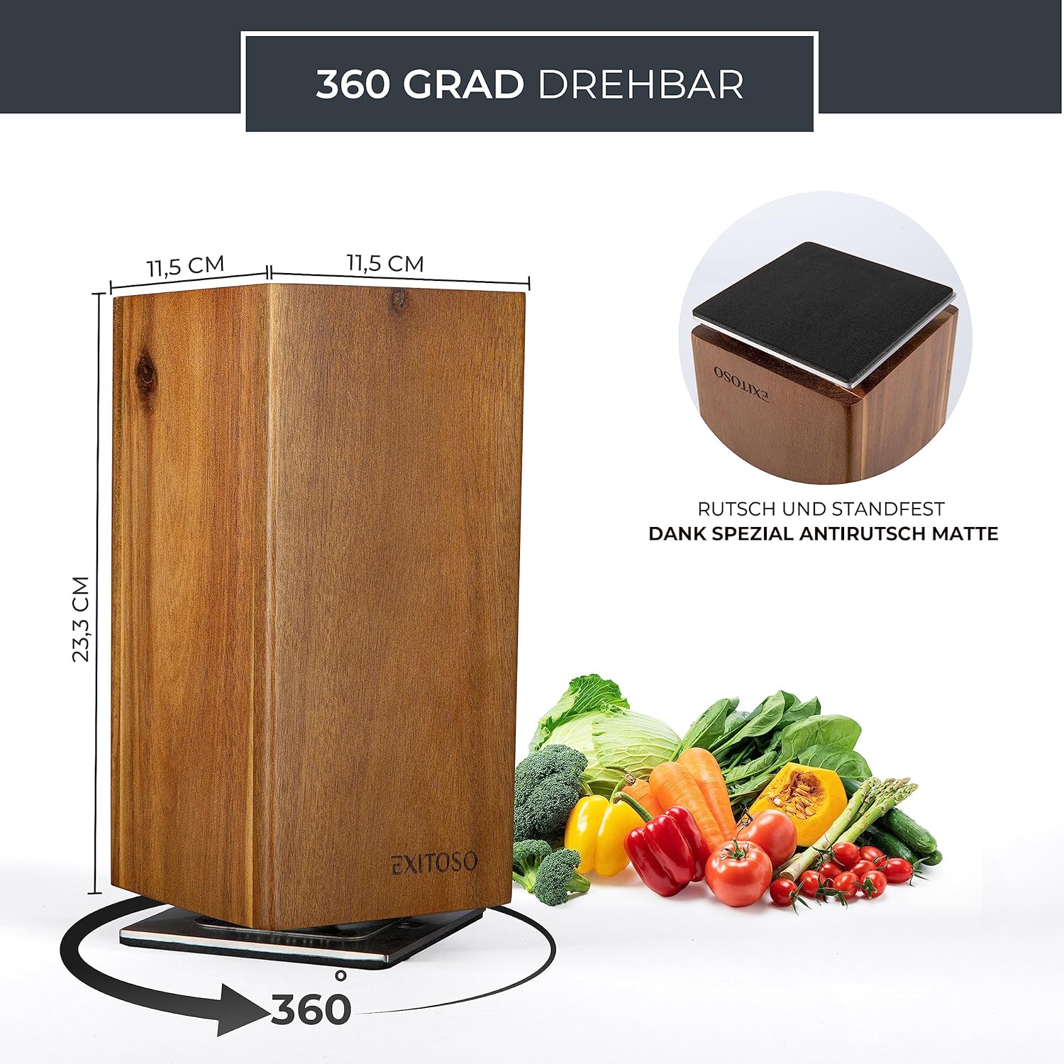 Блок за ножове Exitoso Acacia, въртящ се на 360 градуса с външни магнити и подвижна вложка с косъмчета, място за до 20 ножа, безопасно съхранение на ножове, дървен блок за ножове (без ножове)