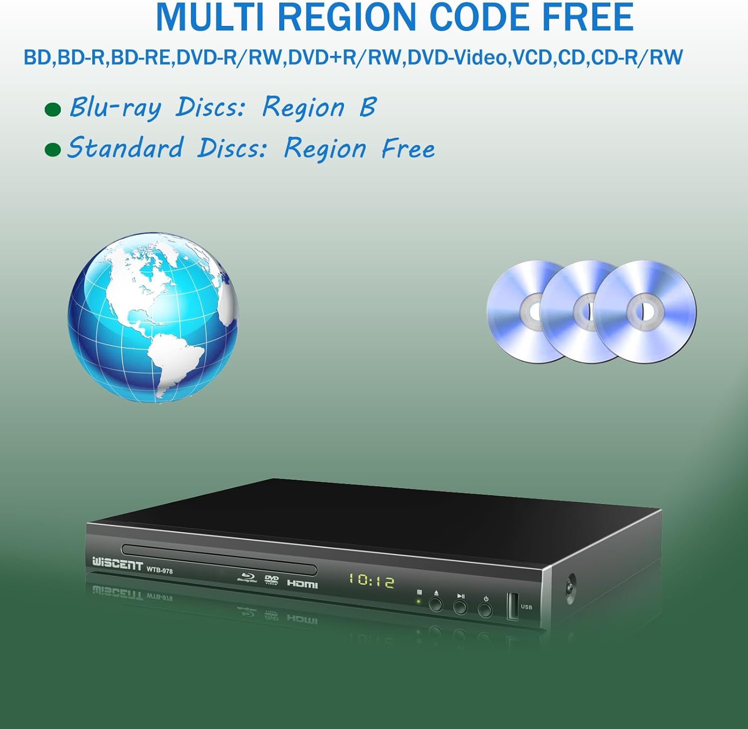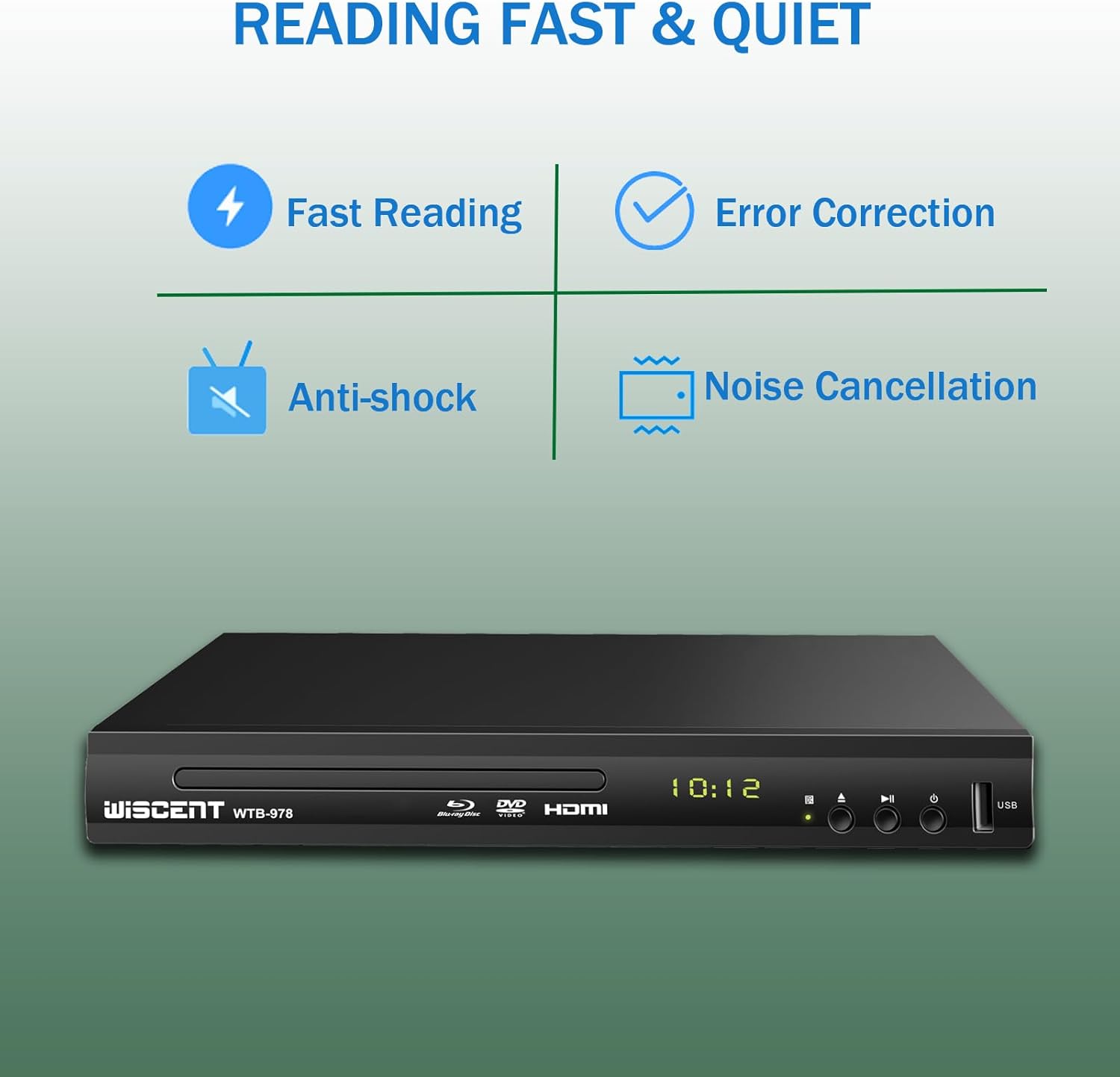 Blu-Ray плейър за телевизор, WISCENT DVD плейър с коаксиален/HDMI/AV/изход, USB вход, всички DVD-та и регион B/2 Blu-ray дискове, компактен Full HD 1080p Blu-ray плейър