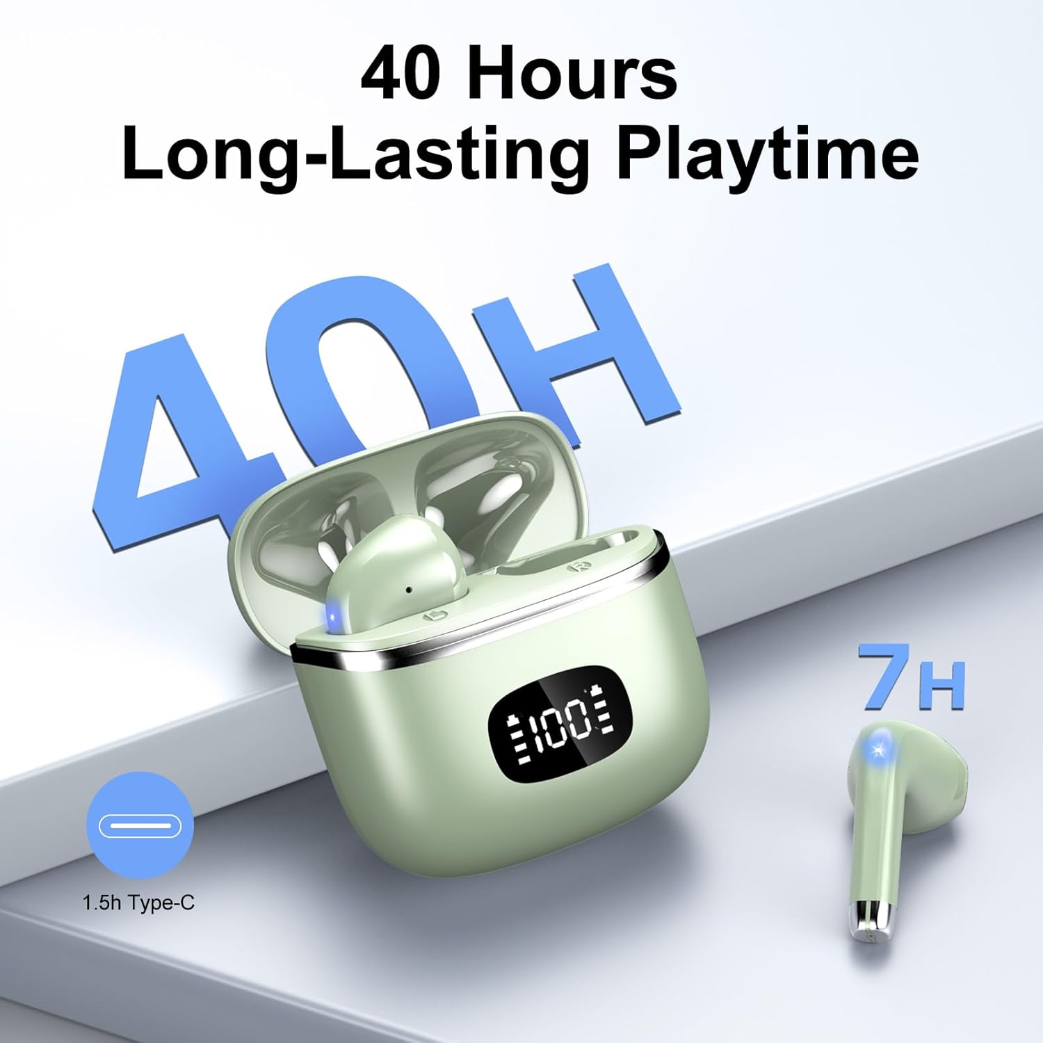 • 40 часа възпроизвеждане и LED дисплей: Bluetooth слушалките за уши могат да се използват самостоятелно 7 часа и 40 часа с кутията за зареждане. Bluetooth слушалките използват порт за бързо зареждане тип C. Цифровият LED дисплей може да проверява оставащия заряд и състоянието на зареждане.