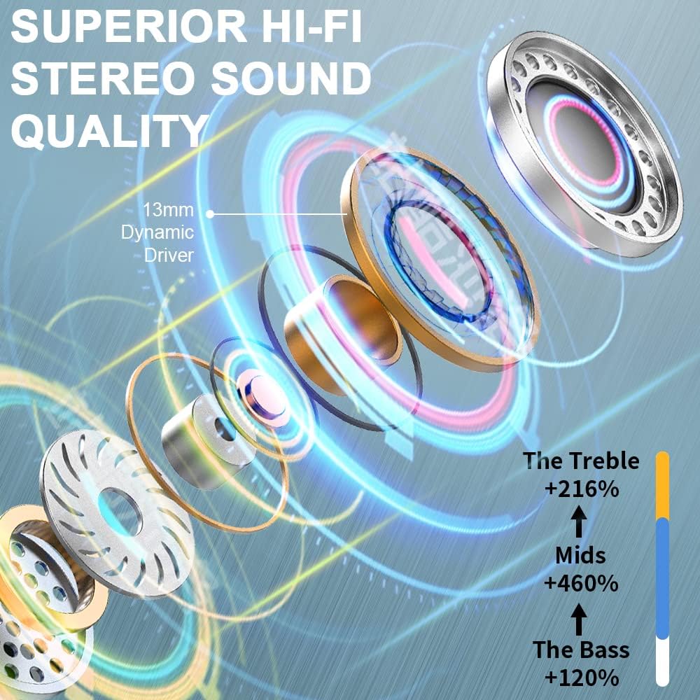 • Слушалки с поглъщащ звук и ENC: J55 Bluetooth слушалки с 13 мм графенова динамична мембрана и технология за аудио кодиране AAC/SBC, които улавят всеки детайл от музиката и предават богат звук с ясни високи честоти и чист бас. Безжичните слушалки използват функция за премахване на околния шум (ENC) и 4 HD микрофона, като околният шум е намален с повече от 38 dB, което гарантира, че гласът ви ще се чува ясно от другата страна.