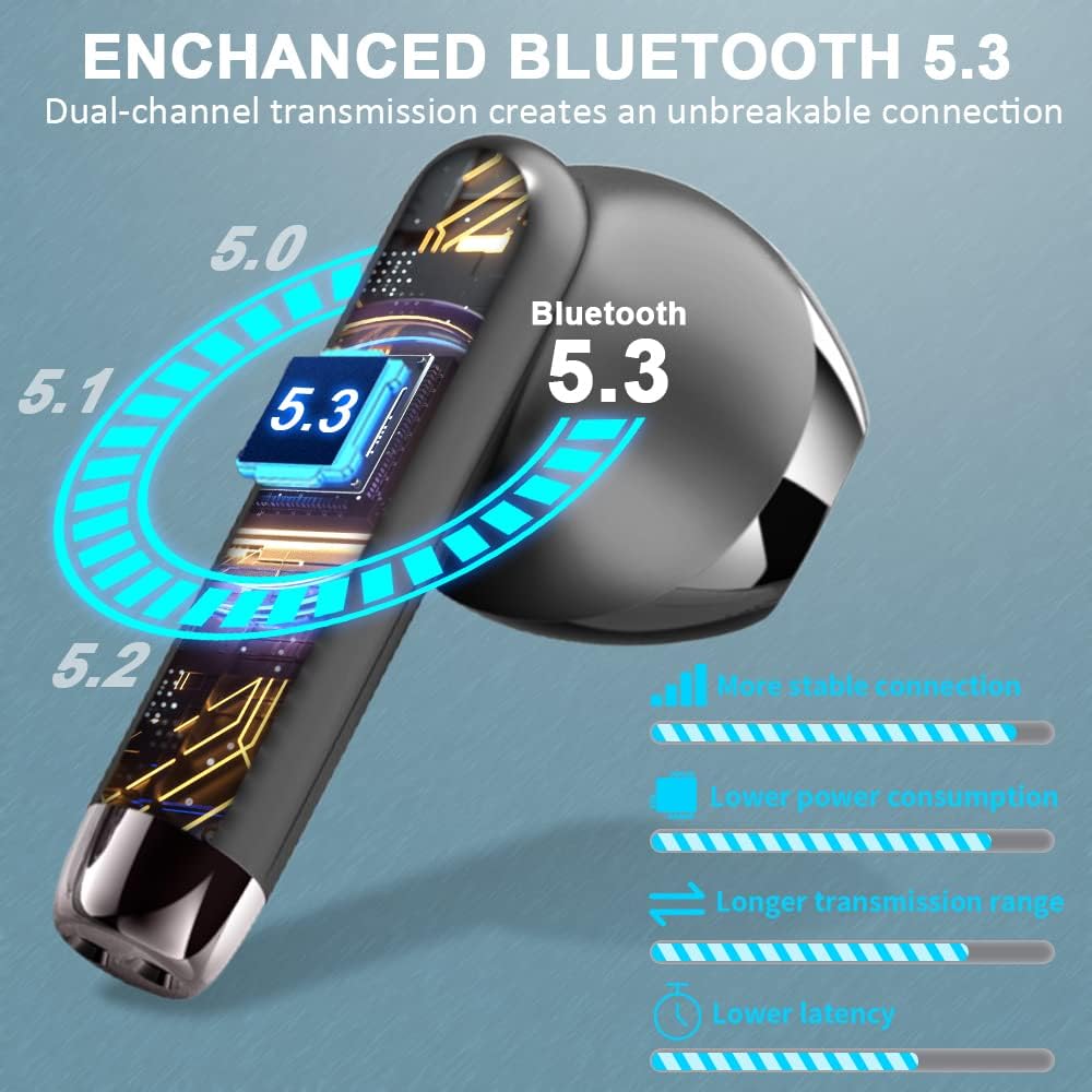 • Bluetooth 5.3 и незабавна връзка: безжичните Bluetooth слушалки са оборудвани с водеща в класа си технология Bluetooth 5.3, която увеличава скоростта на предаване на аудио данни с до 75% и позволява по-стабилни връзки с по-ниска консумация на енергия (обхватът на предаване е до 15 м). Bluetooth слушалките за уши се свързват автоматично с вашия телефон (1S), когато отворите кутията за зареждане. Спестява време за чакане.