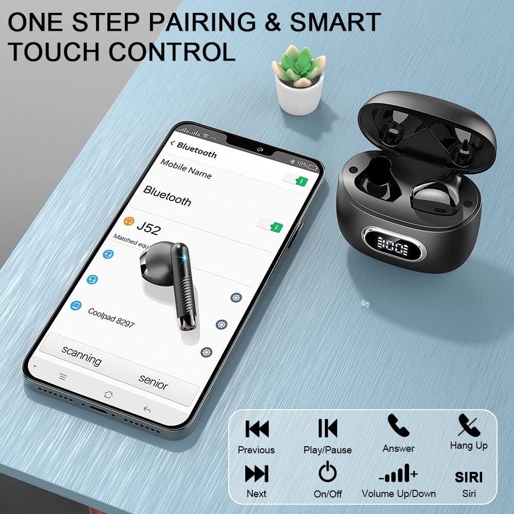 • Универсална съвместимост и сензорно управление: Bluetooth слушалките могат лесно да се сдвоят с всички Bluetooth устройства. С интелигентен дизайн на сензорното управление, няма натиск при докосване, лесни за употреба. Точната позиция за докосване на слушалките в ушите е разположена в горната част на повърхността на слушалките. Просто докоснете за бърз достъп до всички функции, възпроизвеждане/пауза на музика, сила на звука +/-, поддръжка на Siri, включване/изключване, повиквания и др.
