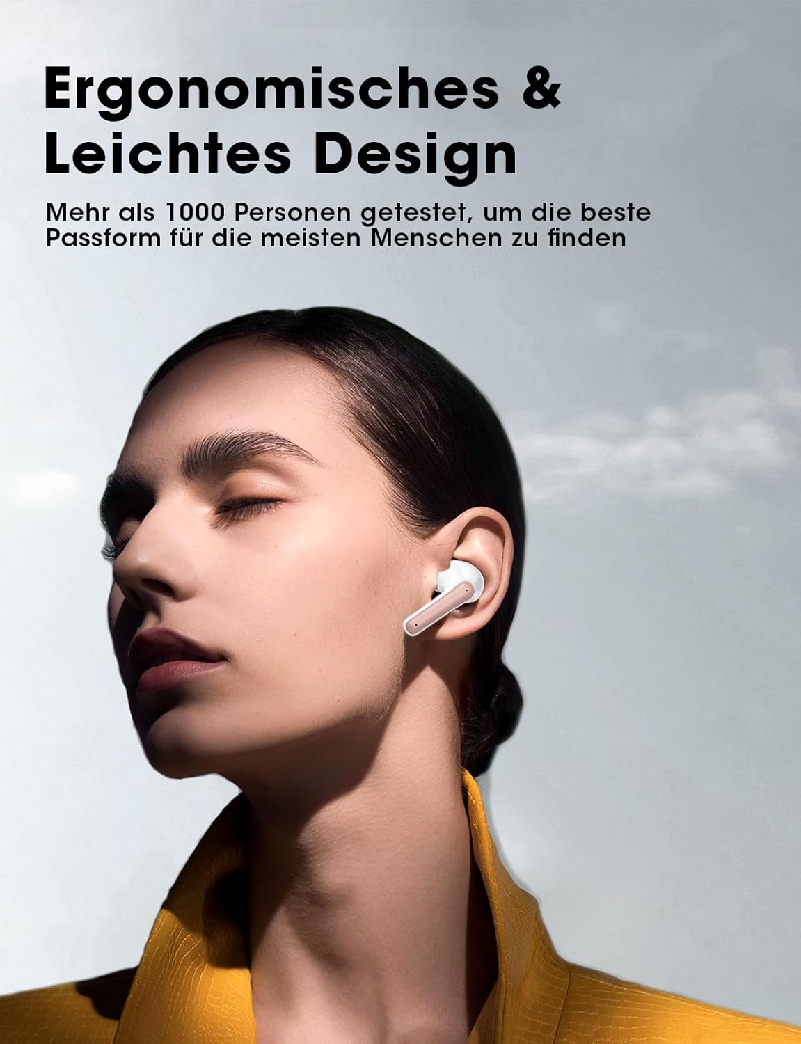 • Леки като перце и комфорт, който ви кара да забравите: нашите безжични слушалки са леки като перце (само 3,8 г на слушалка) и предлагат „комфорт, който ви кара да забравите“, благодарение на ергономичния си дизайн. Три размера на наушниците (S/M/L) осигуряват перфектно прилягане. Ултракомпактният калъф за зареждане ги прави идеален спътник за всеки ден.